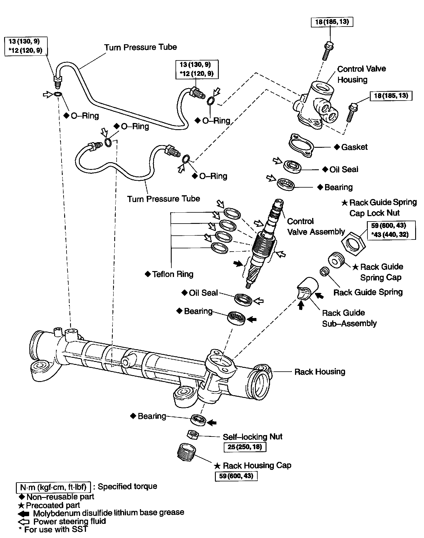 NOTICE: When installing, coat the parts indicated by the arrow with power steering fluid or molybdenum disulfide lithium base grease.