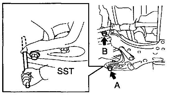 d. Using SST, align the holes of the front suspension member LH and body, and torque the bolt A and B.
