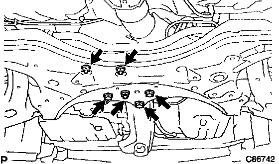 c. Lower the transmission jack, remove the front suspension crossmember sub-assy.