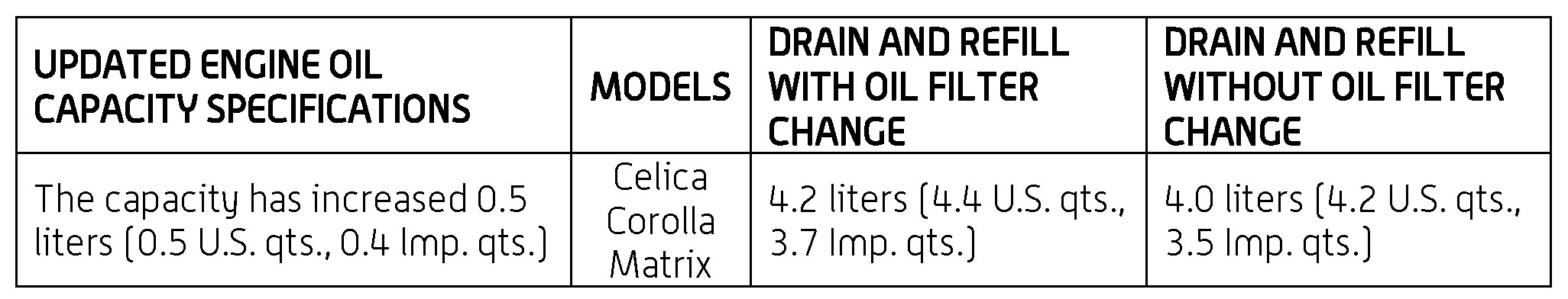 The 1ZZ-FE engine oil capacity and oil level gauge assembly (dipstick) has been updated for specific model year Celica, Corolla, and Matrix vehicles. Refer to the information below for the updated capacity and part number information.