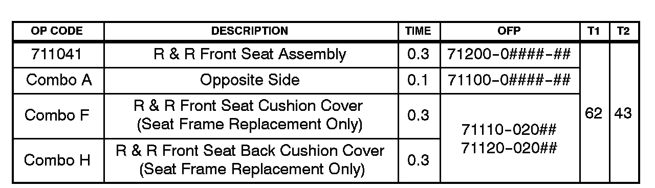 For seat assembly/seat frame assembly removal and installation instructions, refer to the Technical Information System (TIS):