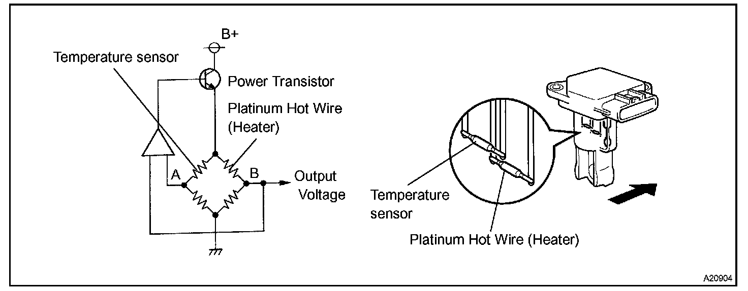 By applying a specific current to the wire, the ECM heats this wire to a given temperature. The flow of incoming air cools the wire and an internal thermistor, changing their resistance. To maintain a constant current value, the ECM varies the voltage applied to these components in the MAF meter. The voltage level is proportional to the airflow through the sensor and the ECM interprets this voltage as the intake air amount. The circuit is constructed so that the platinum hot wire and temperature sensor provide a bridge circuit, with the power transistor controlled so that the potential of A and B remains equal to maintain the set temperature.