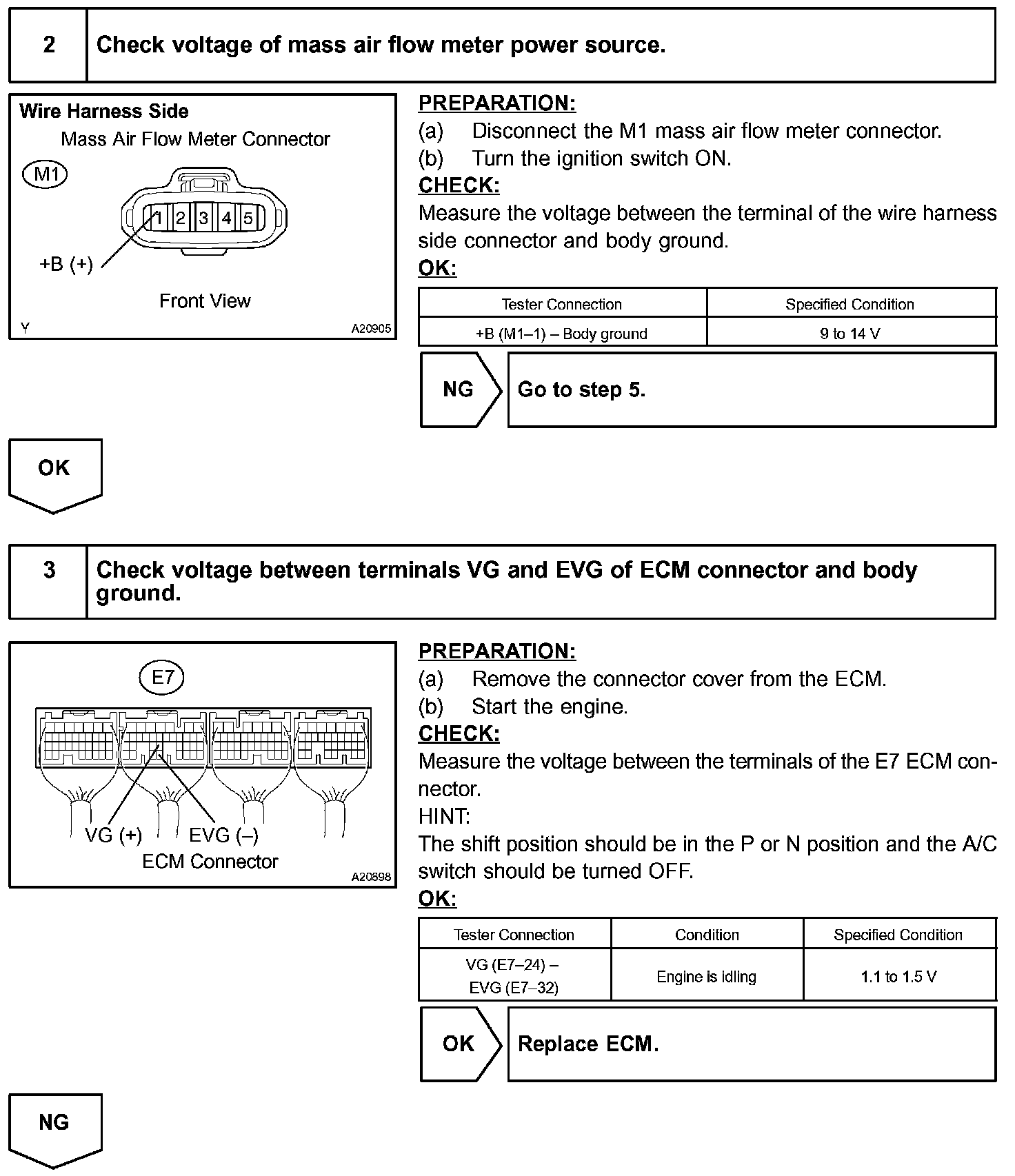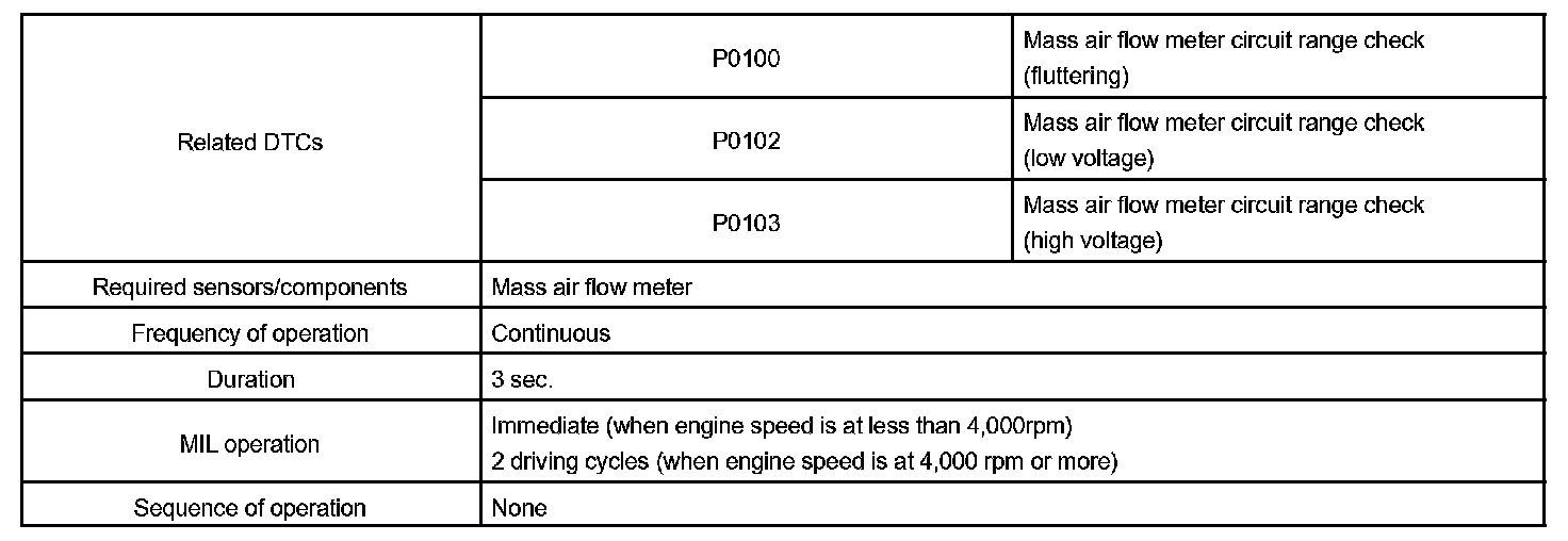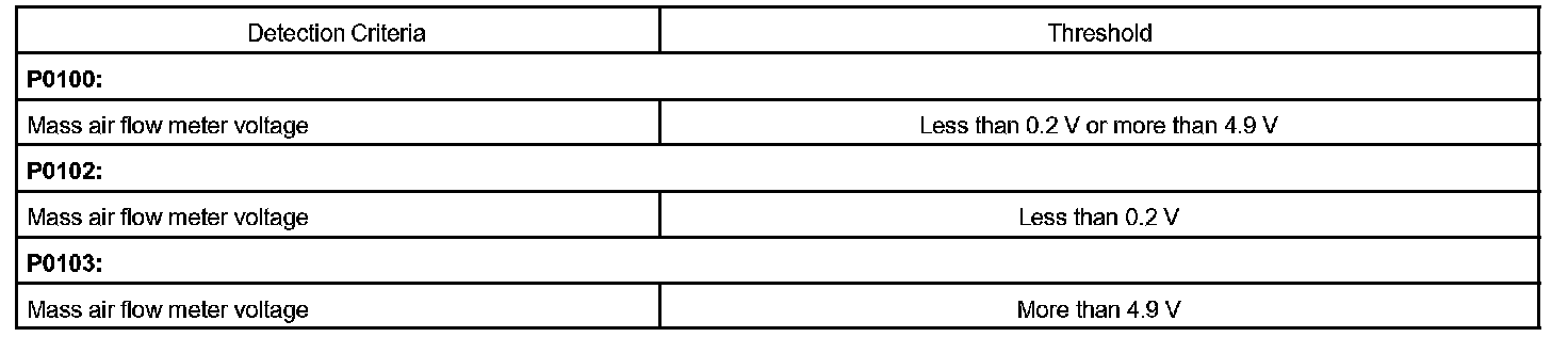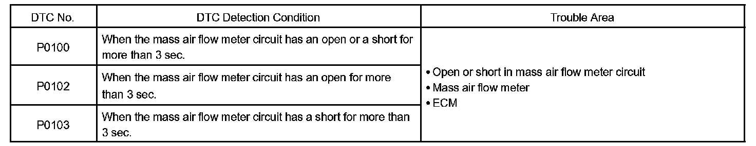 If there is a defect in the sensor or an open or short circuit, the voltage level will deviate outside the normal operating range. The ECM interprets this deviation as a defect in the MAF (Mass Air Flow) meter and sets a DTC.