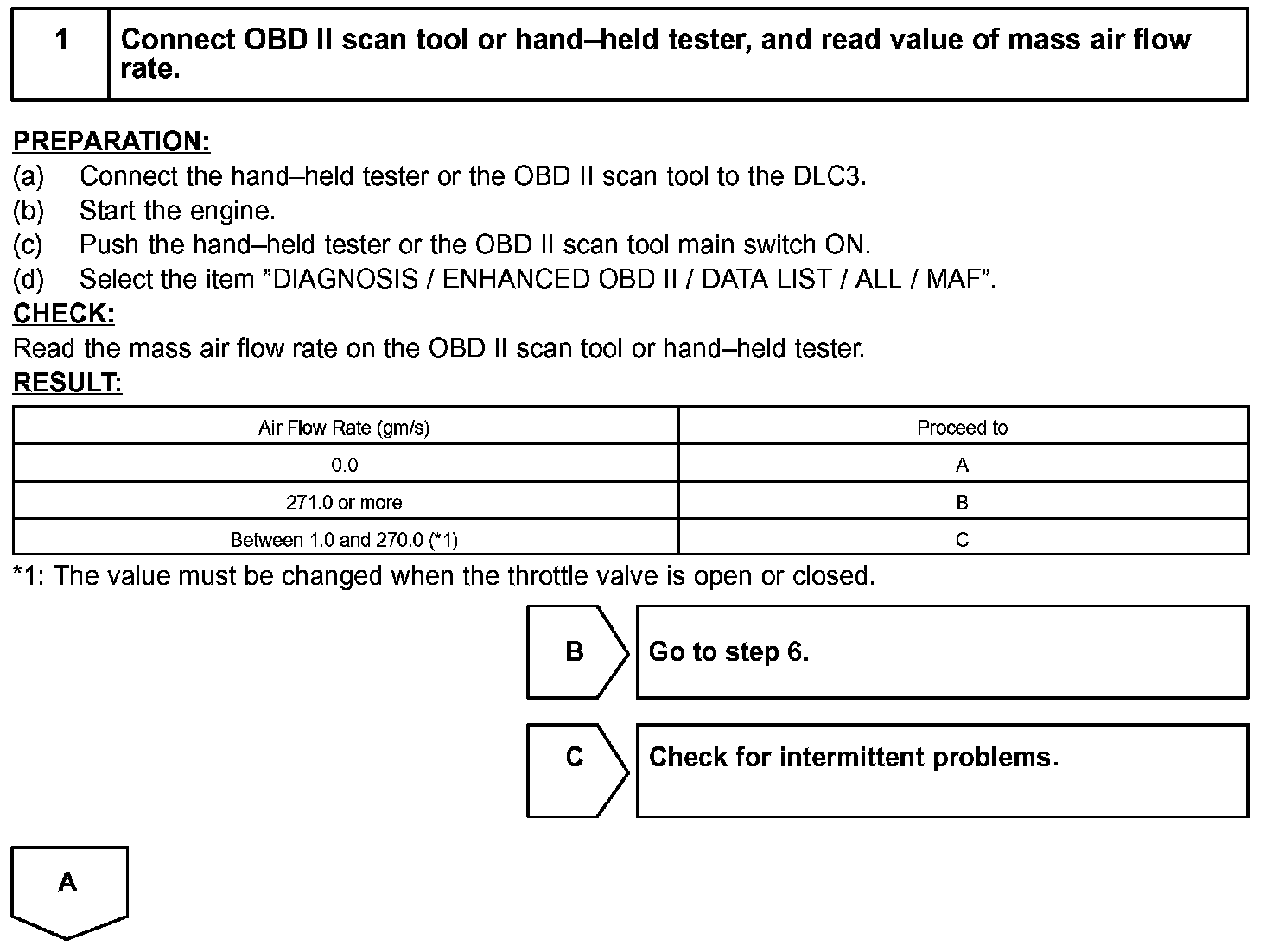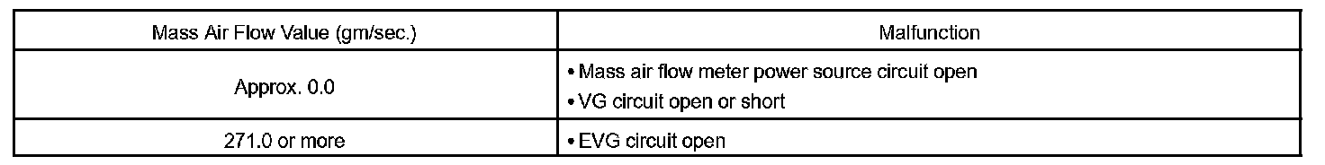 HINT: After confirming DTC "P0100, P0102 or P0103", use the hand-held tester or the OBD II scan tool to confirm the mass air flow ratio from the "DIAGNOSIS / ENHANCED OBD II / DATA LIST / ALL".