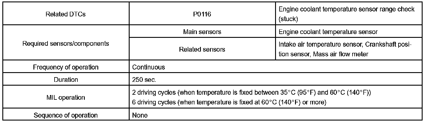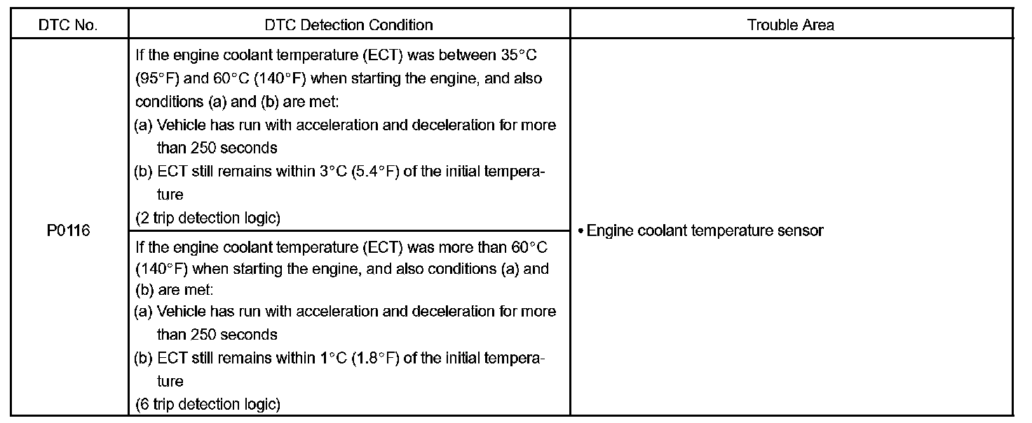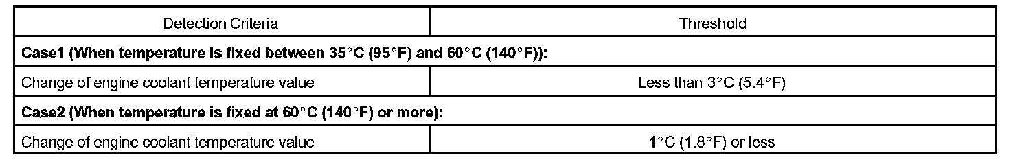 1. Upon starting the engine, the ECT was between 35 °C (95 °F) and 60 °C (140 °F). If after driving for 250 sec., the ECT still remains within 3 °C (5.4 °F) of the staring temperature, a DTC will be set (2 trip detection logic).