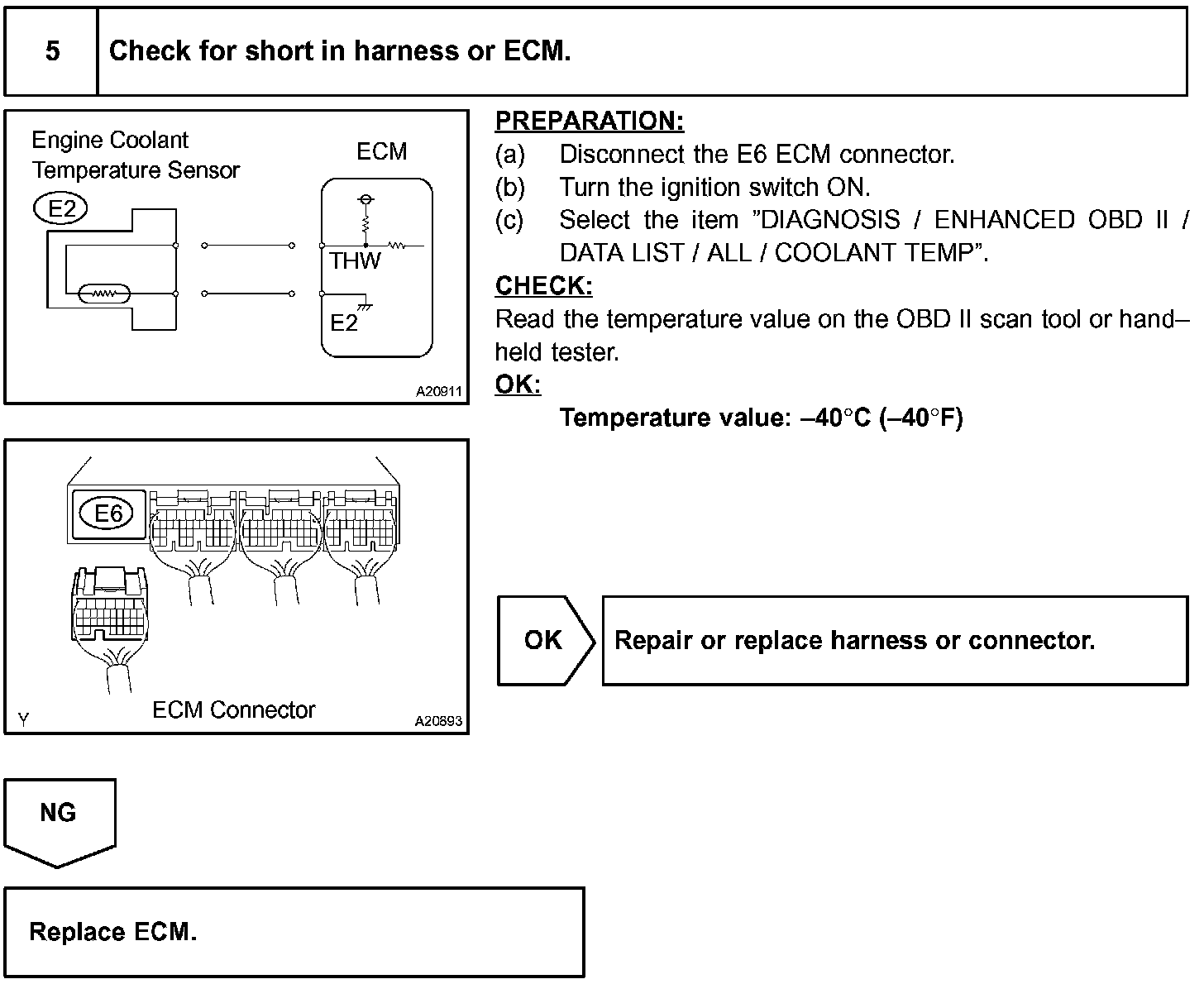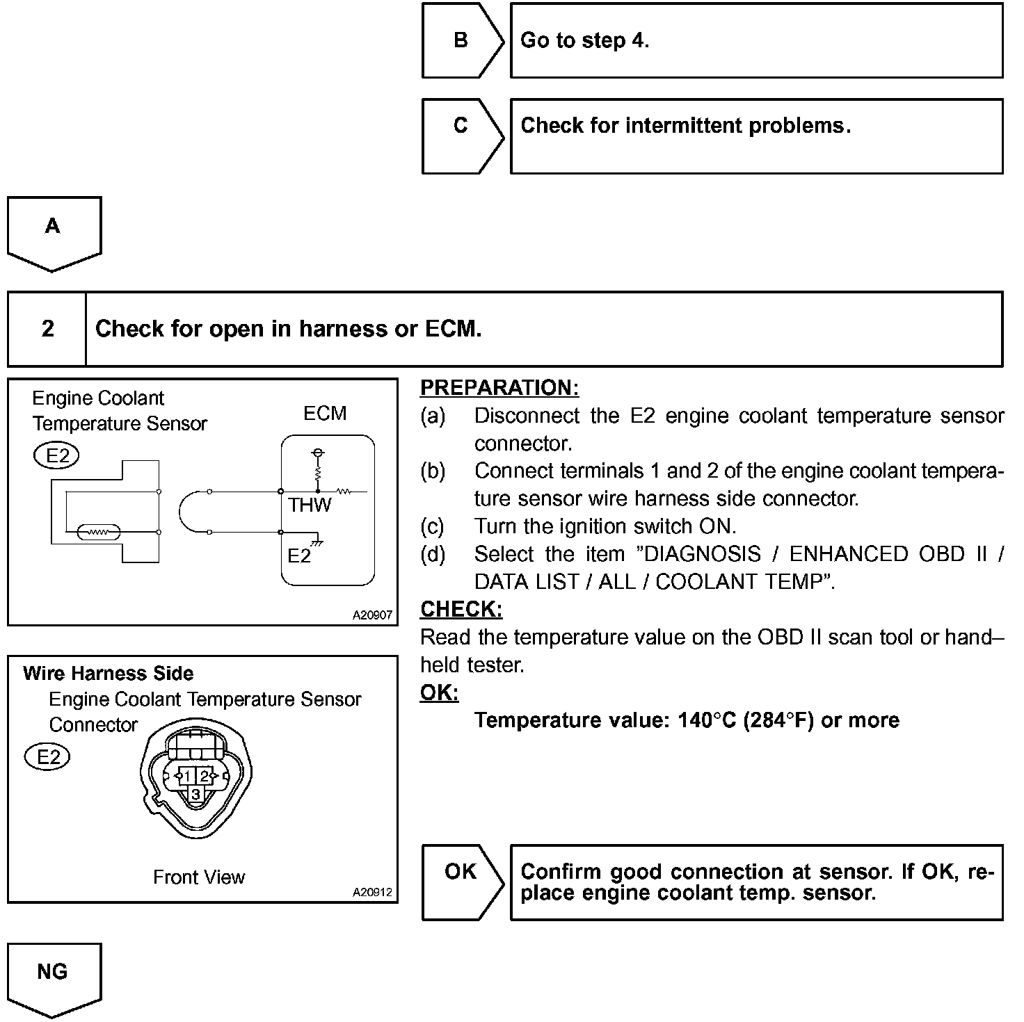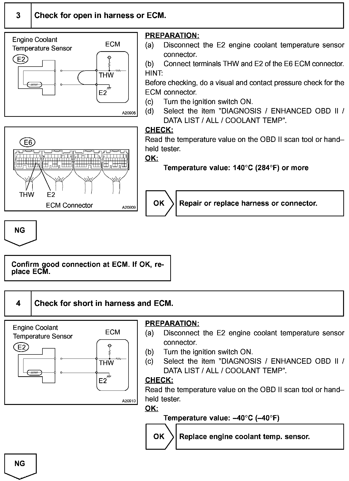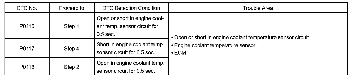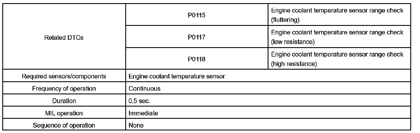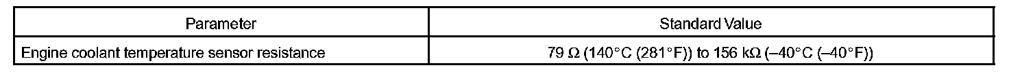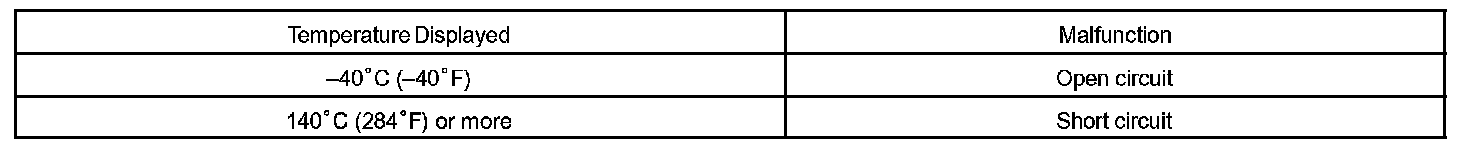 When the ECM calculates that the ECT is less than -40 °C (-40 °F), or more than 140 °C (284 °F), and if either condition continues for 0.5 sec or more, the ETC will set a DTC.