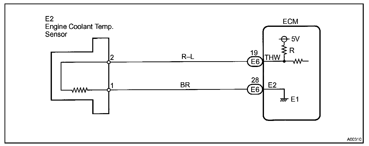 The ECT (engine coolant temperature) sensor is used to monitor the engine coolant temperature. The ECT sensor has a thermistor that varies its resistance depending on the temperature of the engine coolant. When the coolant temperature is low, the resistance in the thermistor increases. When the temperature is high, the resistance drops. The variations in resistance are reflected in the voltage output from the sensor. The ECM monitors the sensor voltage and uses this value to calculate the engine coolant temperature. When the sensor output voltage deviates from the normal operating range, the ECM interprets this as a fault in the ECT sensor and sets a DTC.