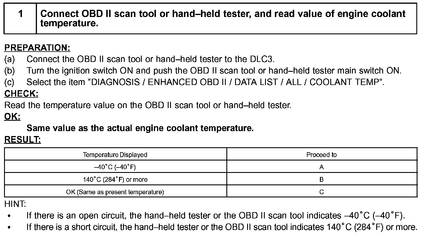 - After confirming DTC "P0115, P0117 or P0118", use the hand-held tester or the OBD II scan tool to confirm the engine coolant temperature from the "DIAGNOSIS/ENHANCED OBD II/DATA LIST/ALL".