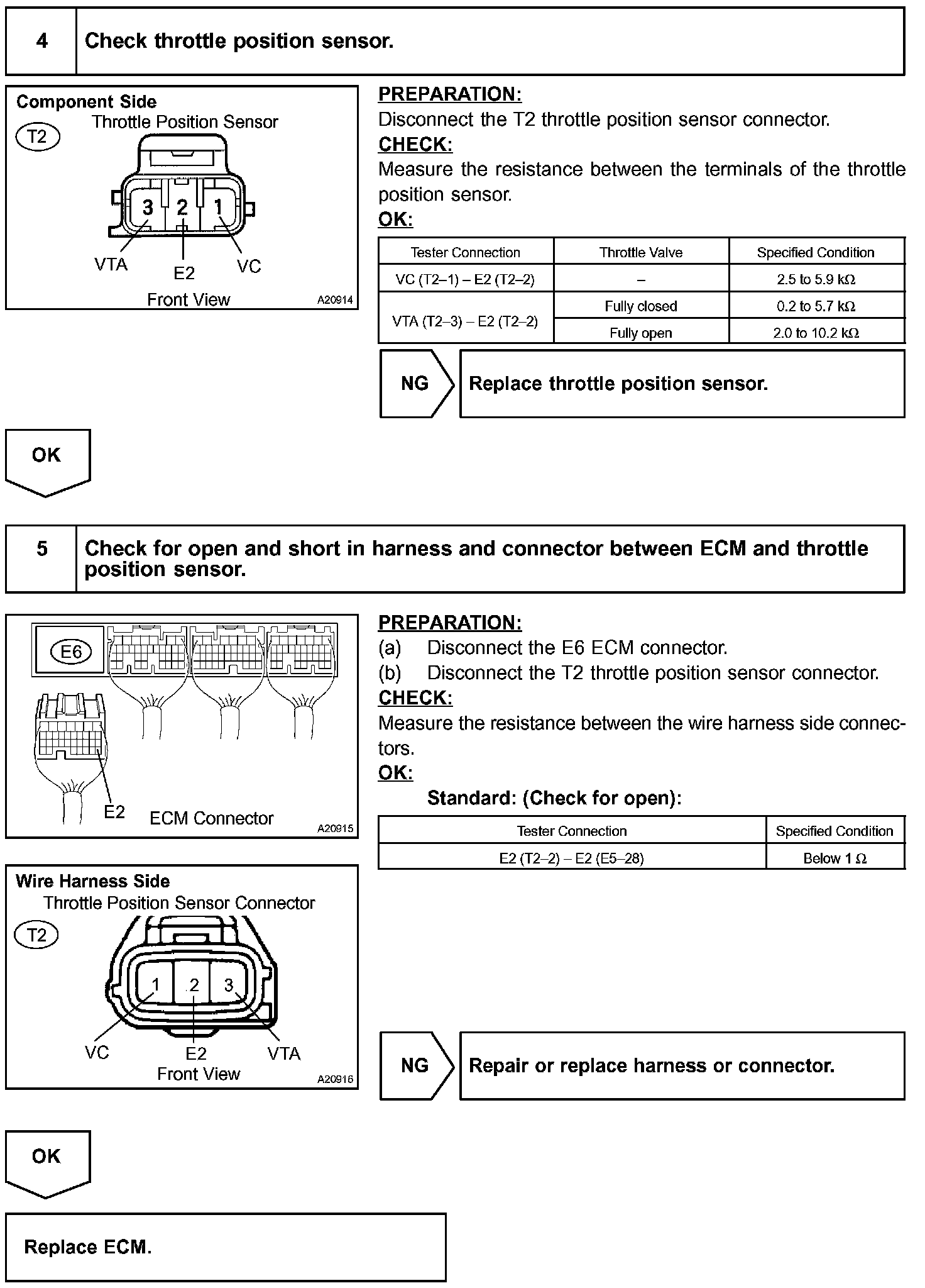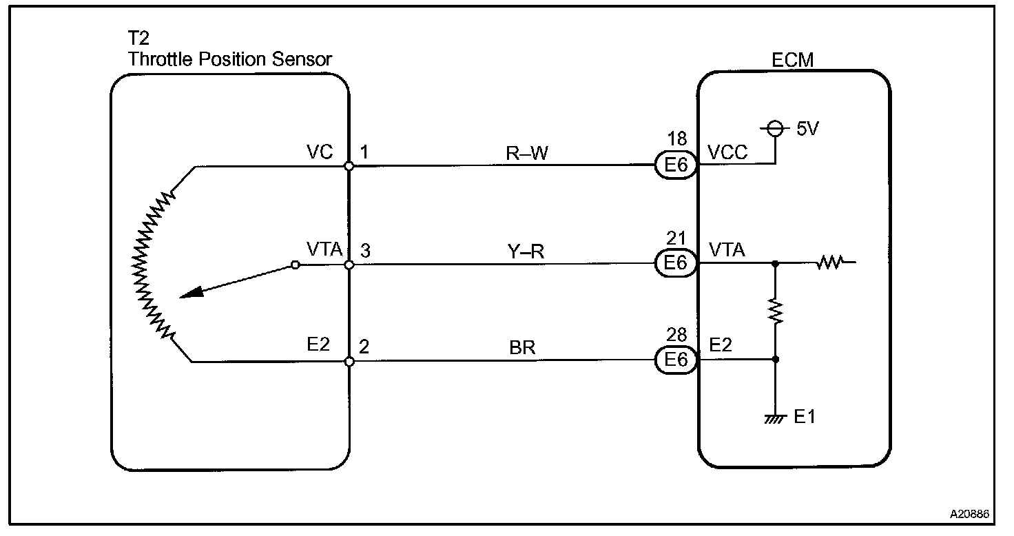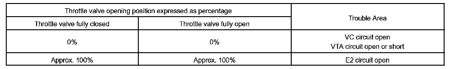 When the throttle valve is fully closed, a voltage of approximately 0.3 to 0.8 V is applied to terminal VTA of the ECM. The voltage applied to terminal VTA of the ECM increases in proportion to the opening angle of the throttle valve and becomes approximately 3.2 to 4.9 V when the throttle valve is fully opened. The ECM judges the vehicle driving conditions from these signals input from terminal VTA, uses them as one of the conditions for the air-fuel ratio correction, power increase correction and fuel cut control etc.