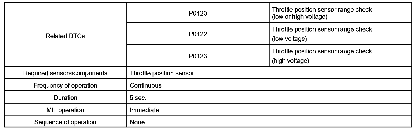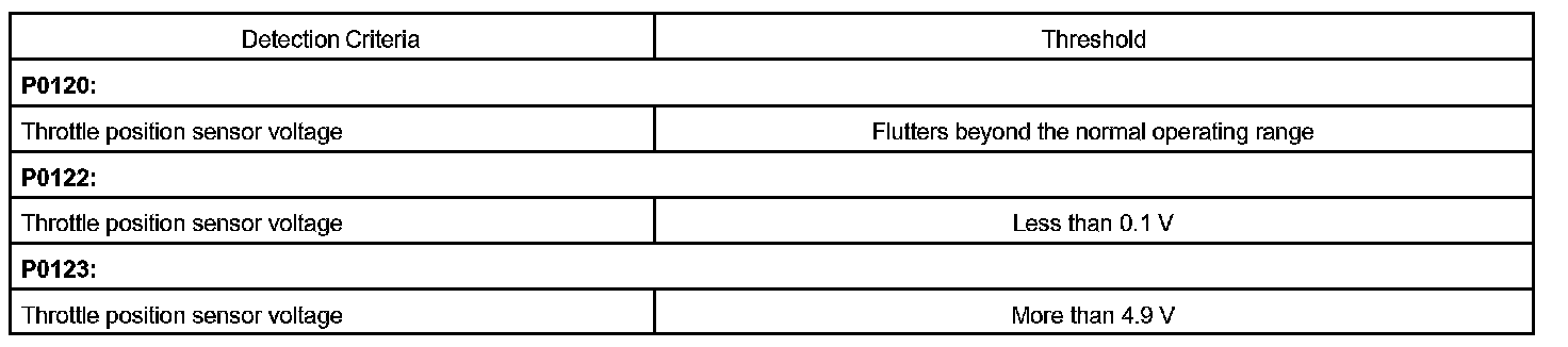 If the ECM detects that the output voltage of the throttle position sensor is out of the normal range, the ECM interprets this as a malfunction in the throttle position sensor and sets a DTC.