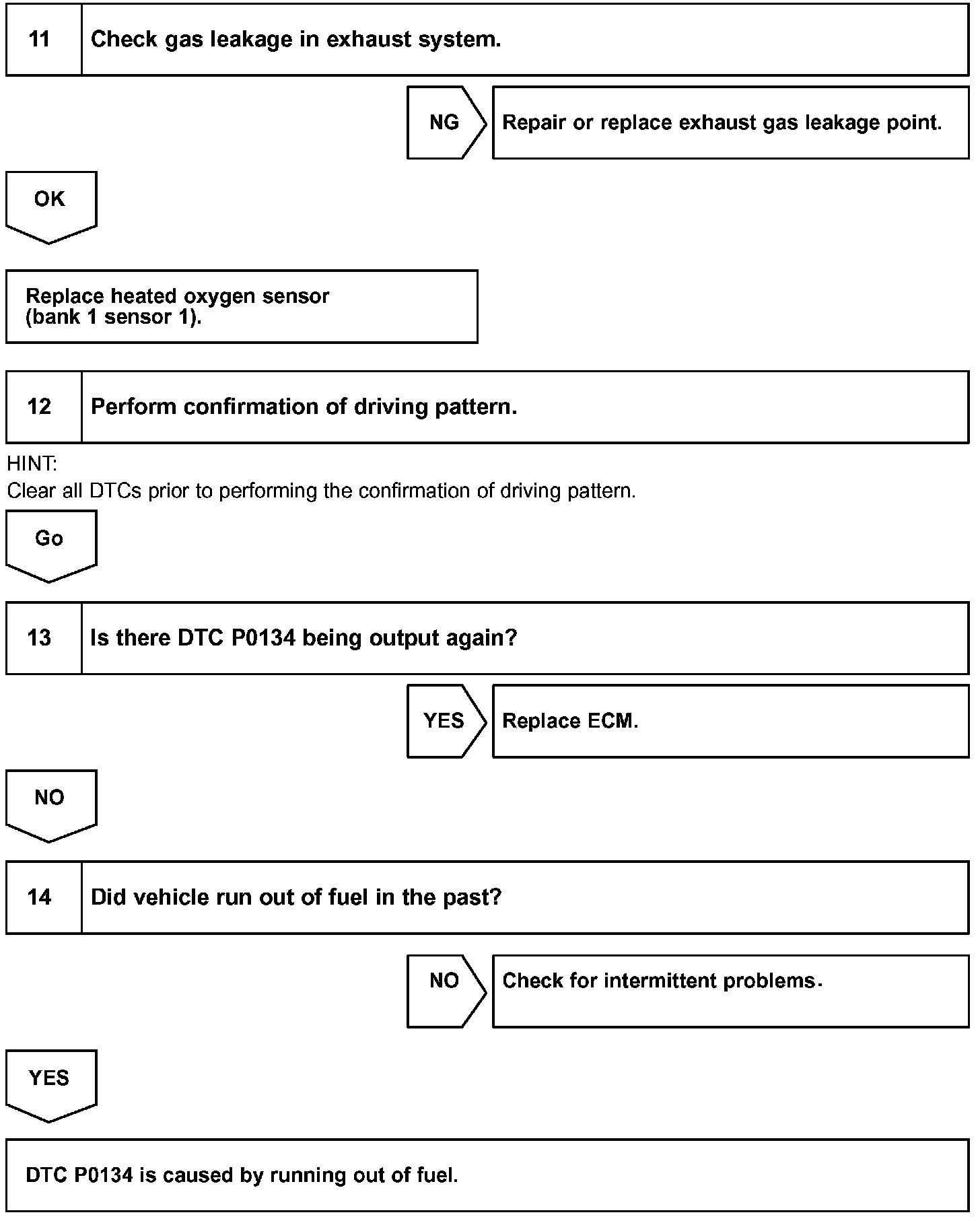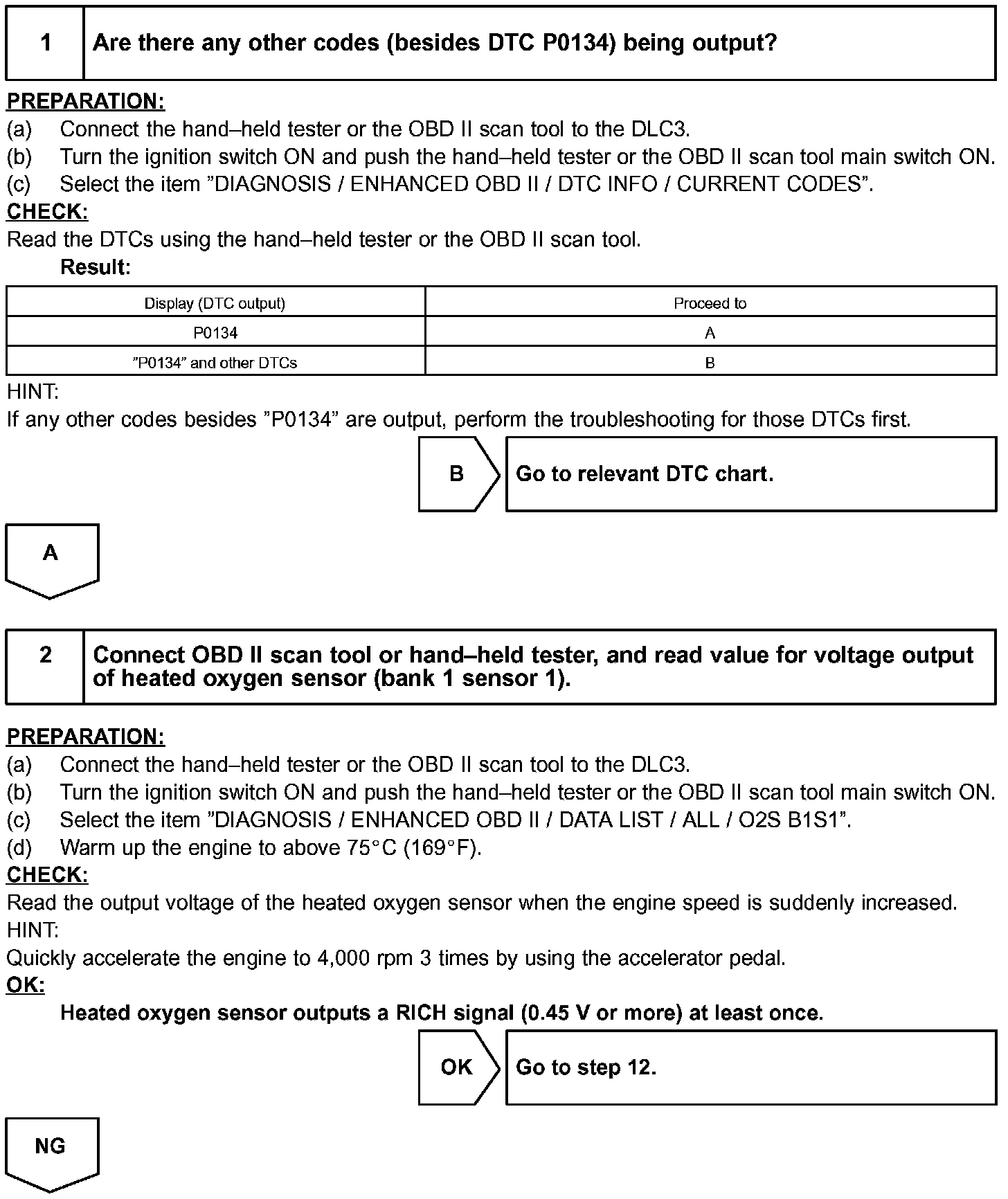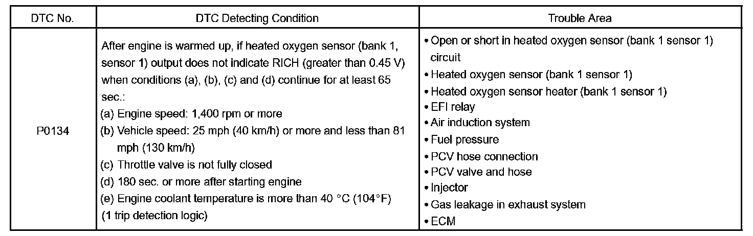 HINT: After confirming DTC "P0134", use the hand-held tester or the OBD II scan tool to confirm the output voltage of the heated oxygen sensor (bank 1 sensor 1) from the "DIAGNOSIS / ENHANCED OBD II / DATA LIST / ALL". If the output voltage of the heated oxygen sensor is always less than 0.1 V, the heated oxygen sensor circuit may be open or short.