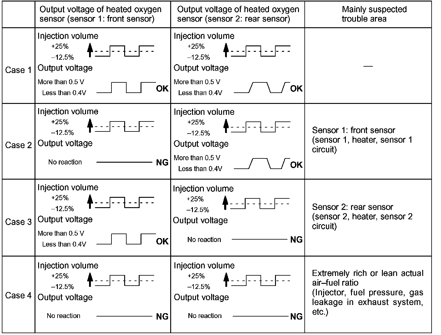 When the air-fuel ratio becomes LEAN, the oxygen concentration in the exhaust gas increases. And the heated oxygen sensor informs the ECM of the LEAN condition (low voltage, i.e. less than 0.45 V).