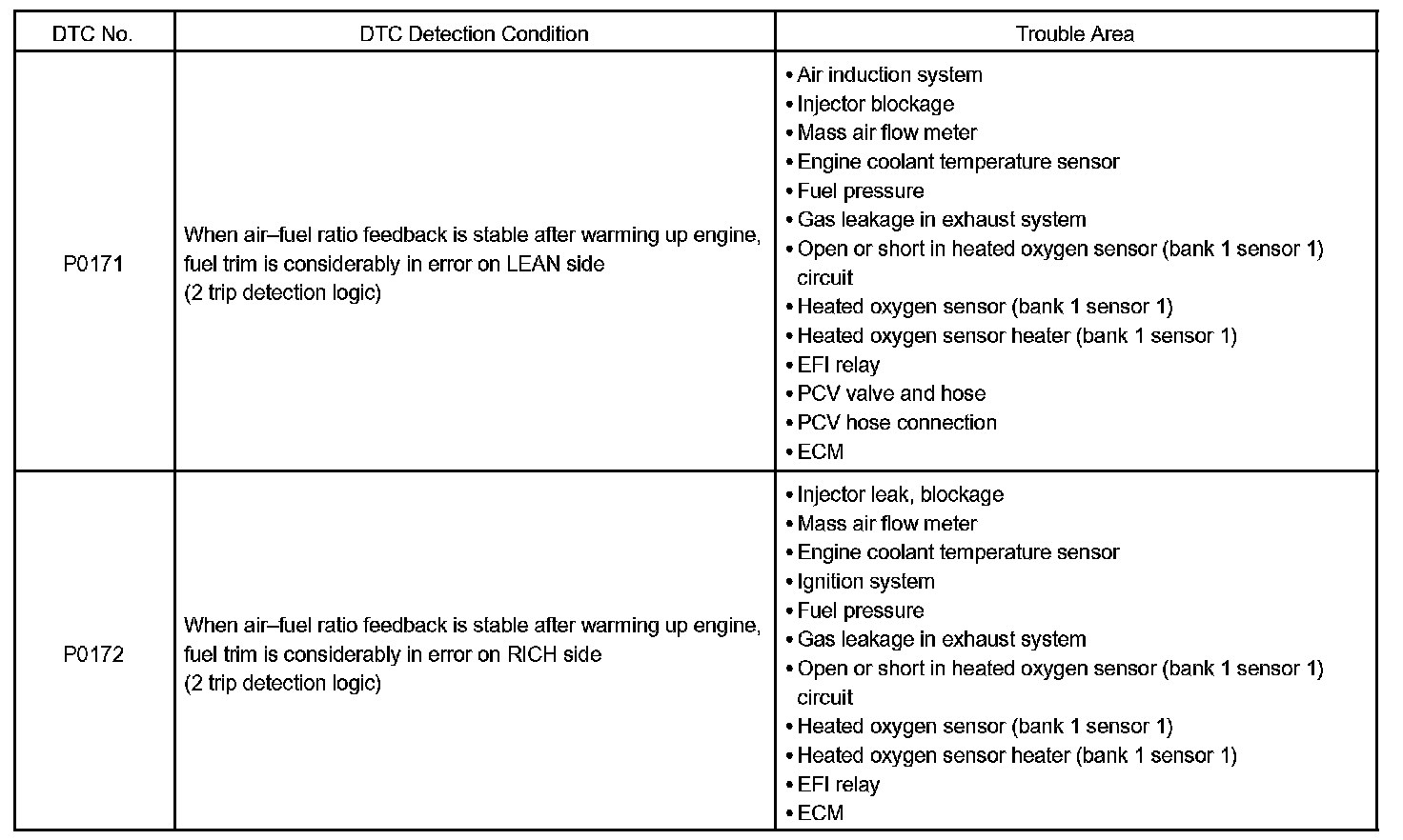 - When DTC "P0171" is recorded, the actual air-fuel ratio is on the LEAN side. When DTC "P0172" is recorded, the actual air-fuel ratio is on the RICH side.