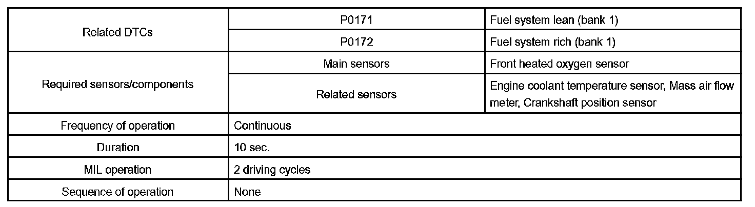 If both the short-term fuel trim and the long-term fuel trim are LEAN or RICH beyond a certain value, it is detected as a malfunction and the MIL is illuminated.