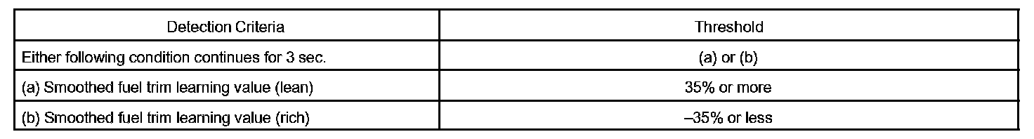 Under closed loop fuel control, fuel injection amounts that deviate from the ECM's estimated fuel amount will cause a change in the long-term fuel trim compensation value. This long-term fuel trim is adjusted when there are persistent deviations in the short-term fuel trim values. And the deviation from a simulated fuel injection amount by the ECM affects a smoothed fuel trim learning value which is the combination of smoothed short-term fuel trim (fuel feedback compensation value) and smoothed long-term fuel trim (learning value of the air-fuel ratio). When the smoothed fuel trim learning value exceeds the DTC threshold, the ECM interprets this as a fault in the fuel system and sets a DTC.