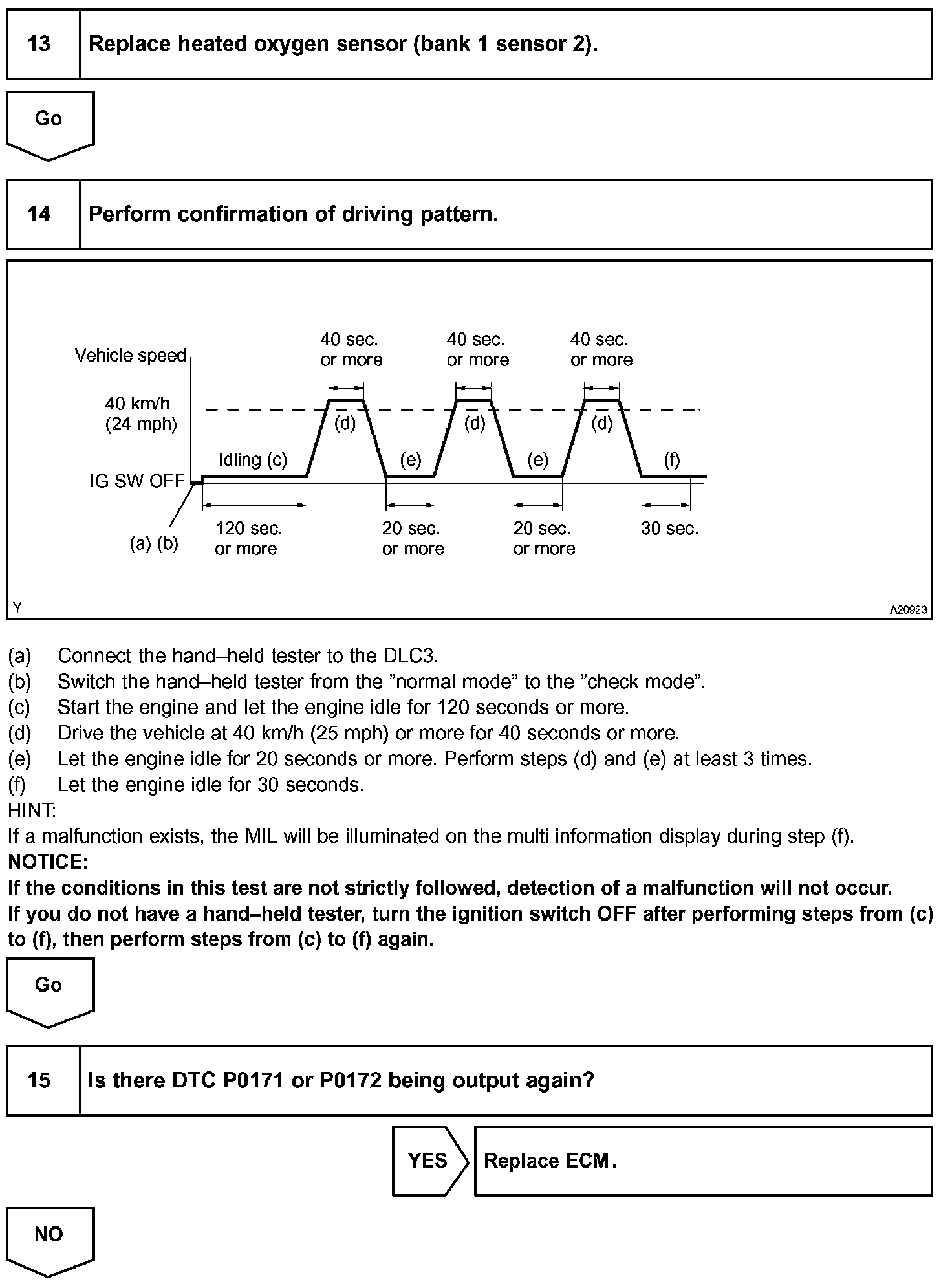 NOTE: If the conditions in this test are not strictly followed, detection of a malfunction will not occur. If you do not have a hand-held tester, turn the ignition switch OFF after performing steps from (c) to (f), then perform steps from (c) to (f) again.