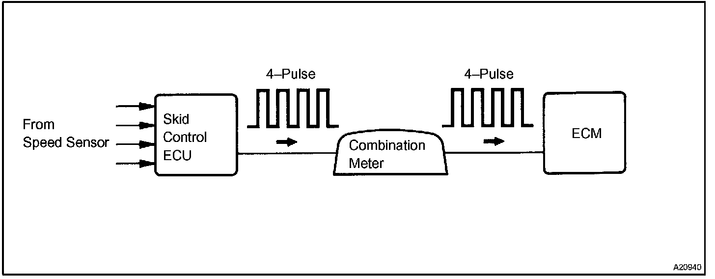 The skid control ECU converts these wheel speed signals into a 4-pulse signal and outputs it to the ECM via the combination meter.