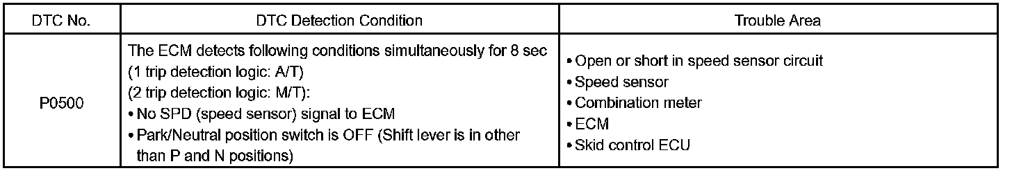 The ECM assumes that the vehicle is driven when the RPM of the transmission counter gear indicates more than 300 rpm and it has been over 30 sec. since the park/neutral position switch was turned OFF. If there is no signal from the vehicle speed sensor with these conditions satisfied, the ECM concludes that there is a fault in the vehicle speed sensor. The ECM will turn on the MIL and a DTC is set.