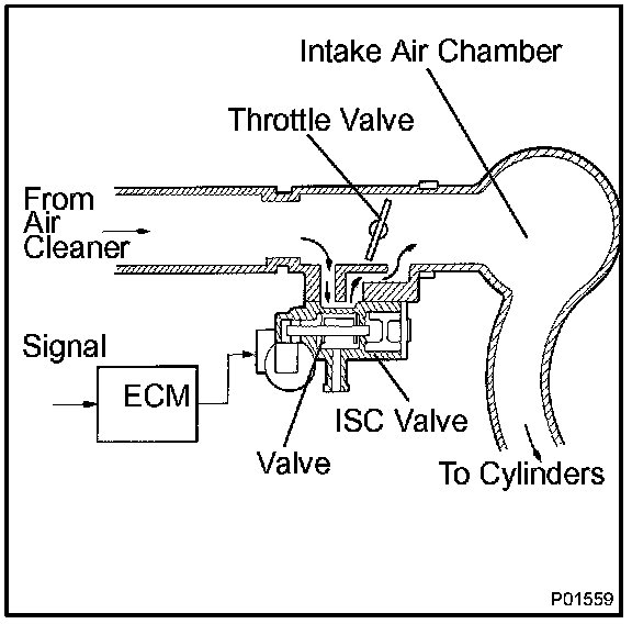 The idle speed is determined depending on the volume of air that passes through the ISC valve. As the volume is large, the idle speed becomes higher. As the volume is small, the idle speed becomes lower. The ISC valve controls the volume of air that bypasses the throttle valve. The ECM (engine control module) sends duty signals to the ISC valve and drives the ISC valve to determine the volume of air that bypasses the throttle valve.