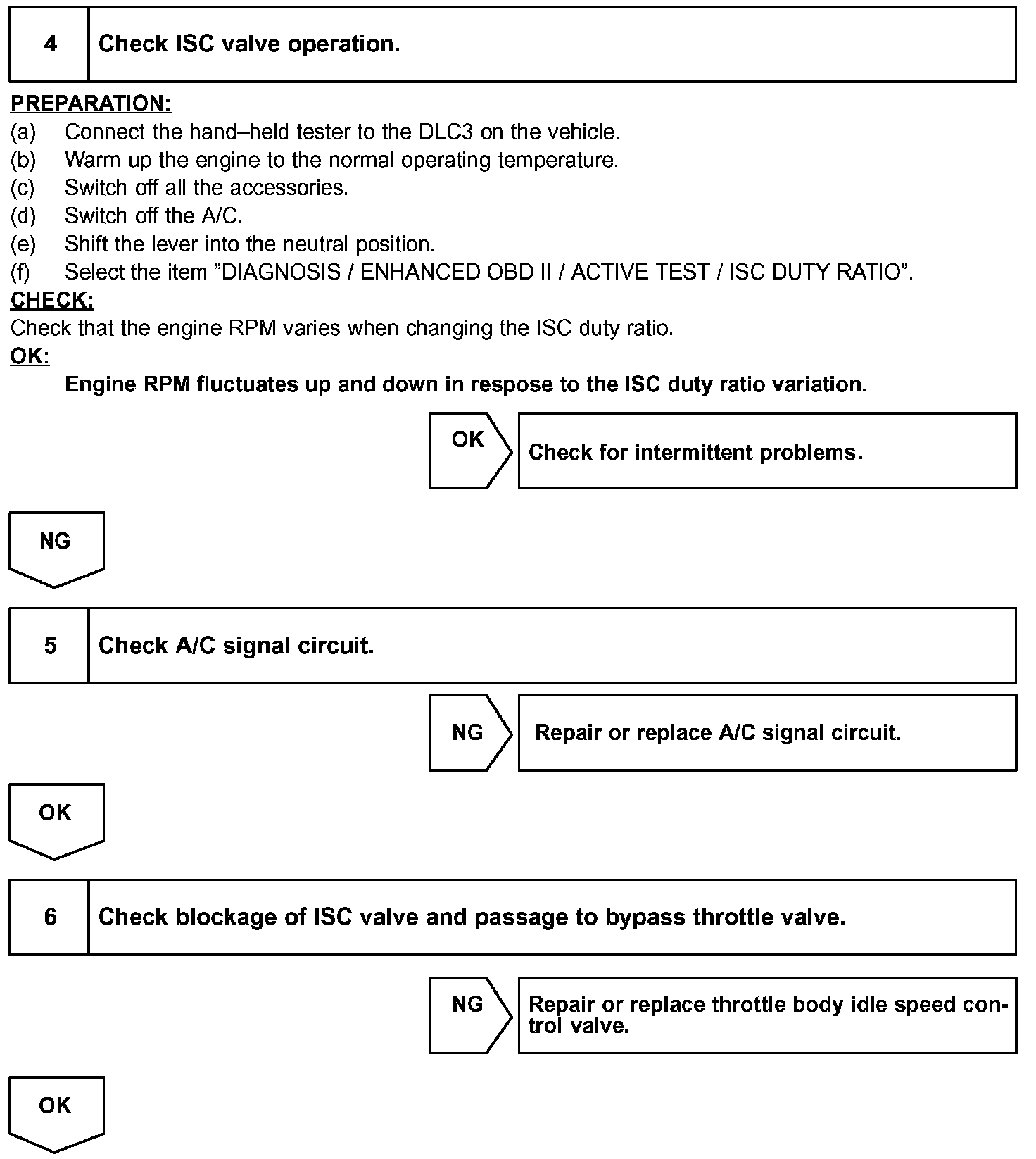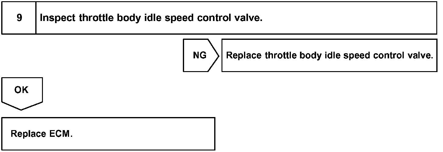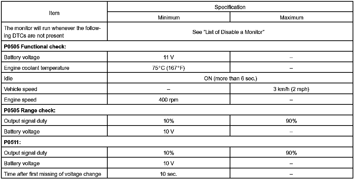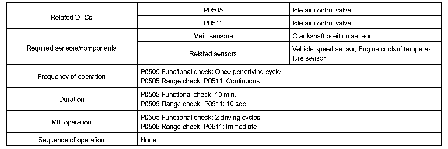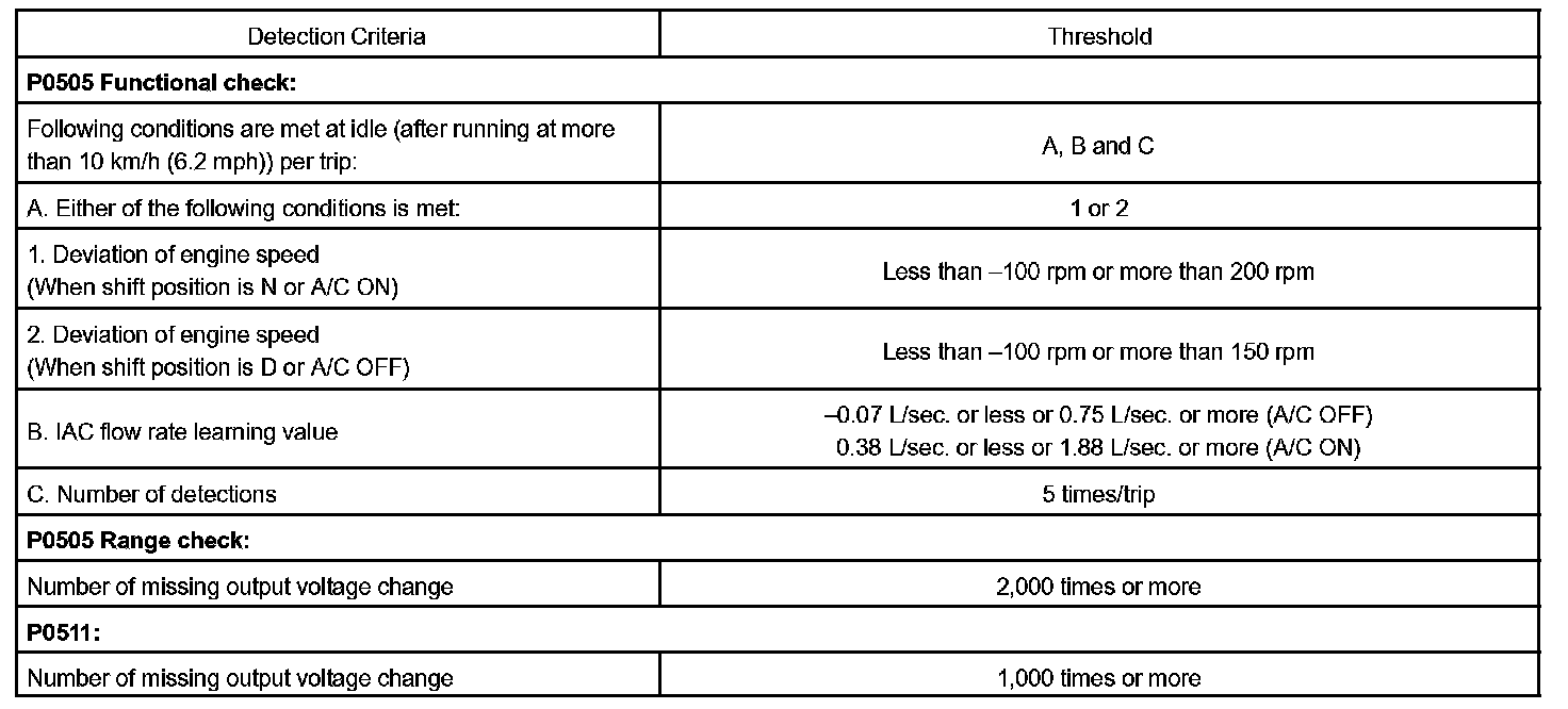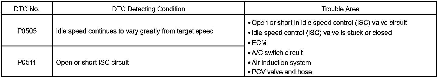 Although the ECM regulates the idle engine RPM with the feedback control, actual idle RPM dose not reach the targeted RPM and a learned valve angle of the ISC (idle speed control) remains at the maximum or remains at the minimum, the ECM determines the condition as a malfunction in the ISC system.