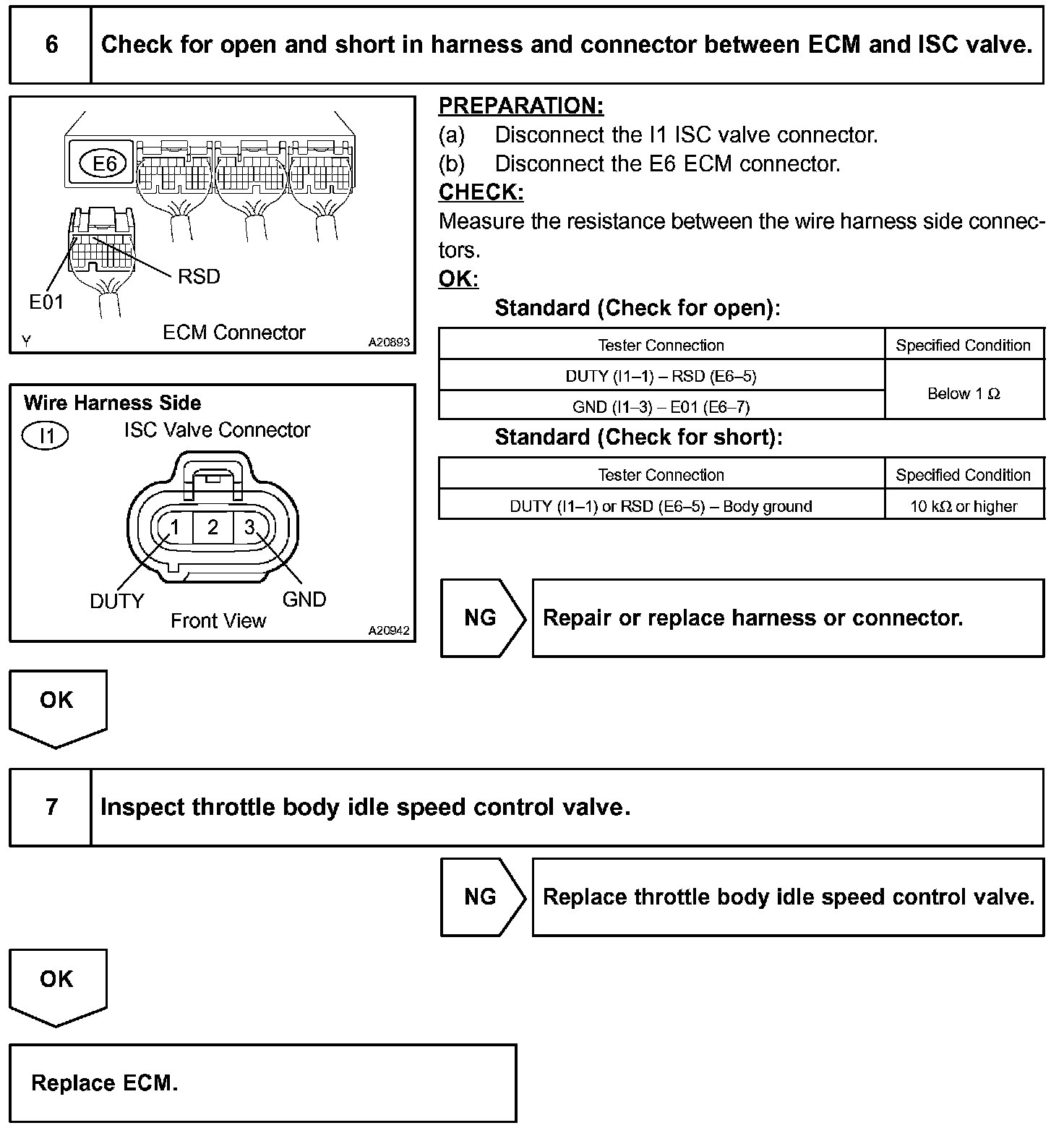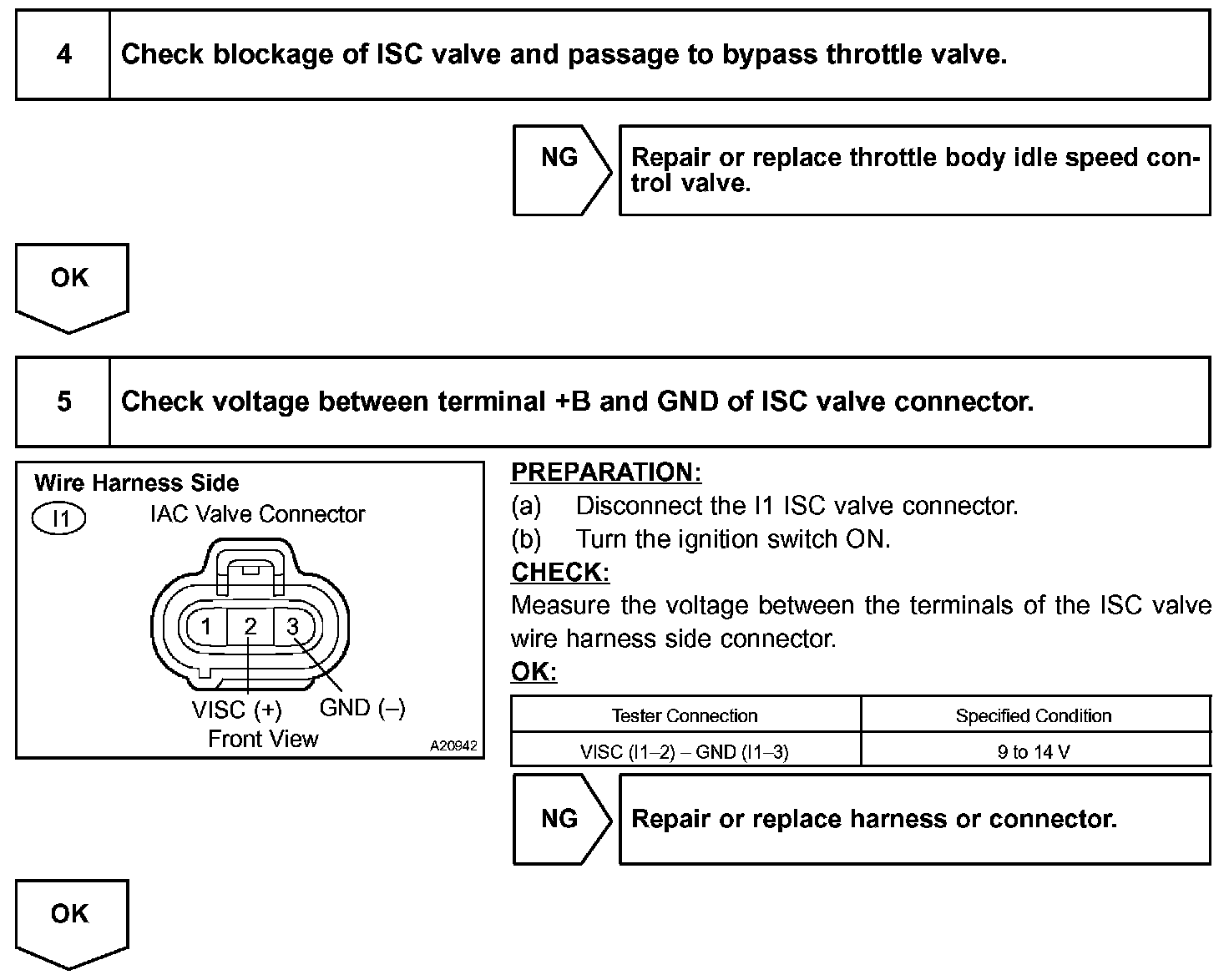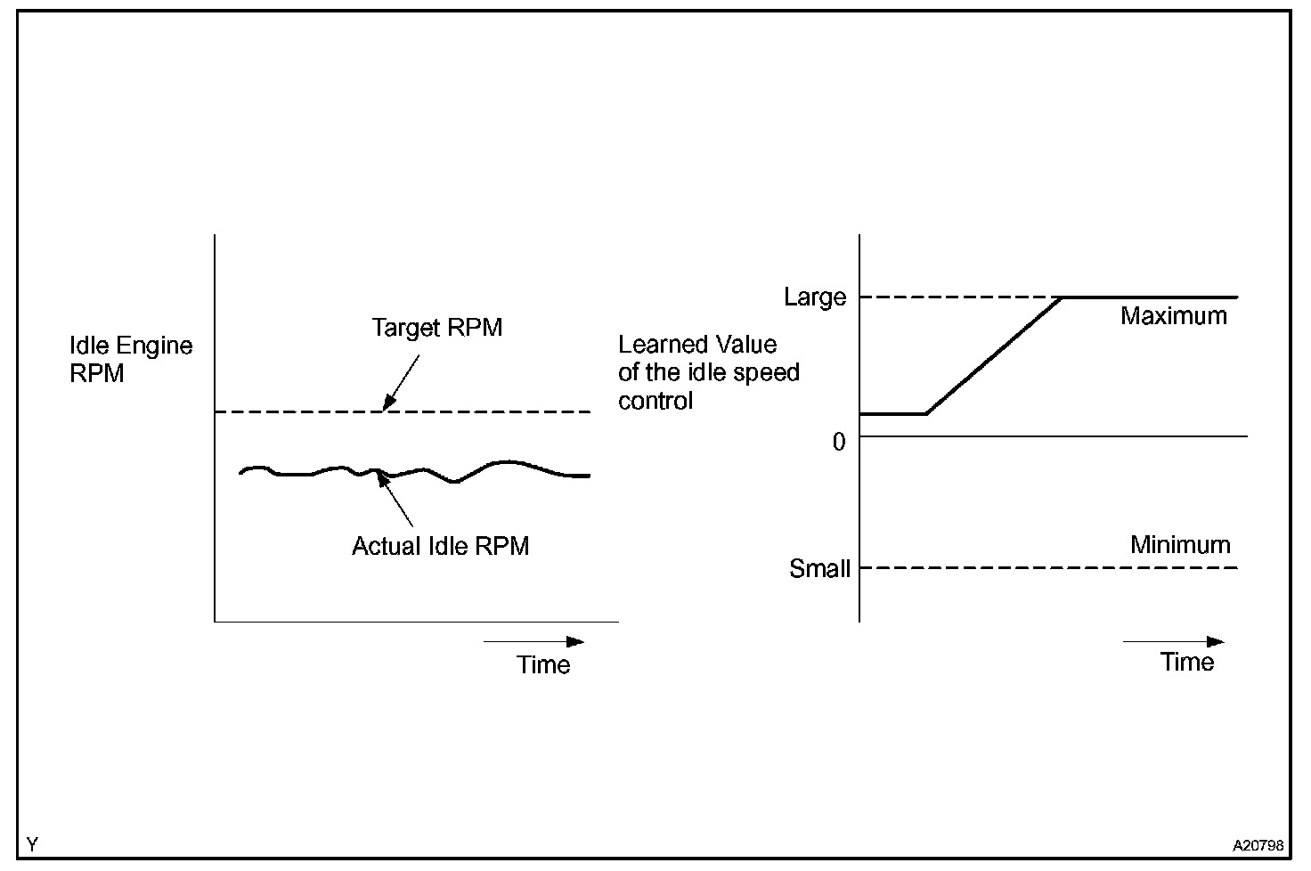 Although the ECM regulates the idle engine RPM with the feedback control, actual idle RPM dose not reach the targeted RPM and a learned valve angle of the ISC (idle speed control) remains at the maximum or remains at the minimum, the ECM determines the condition as a malfunction in the ISC system.