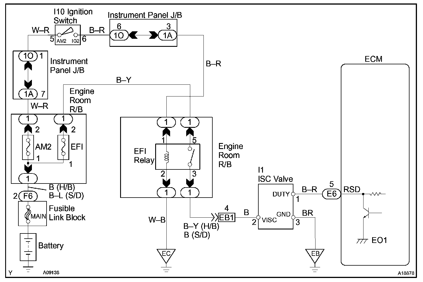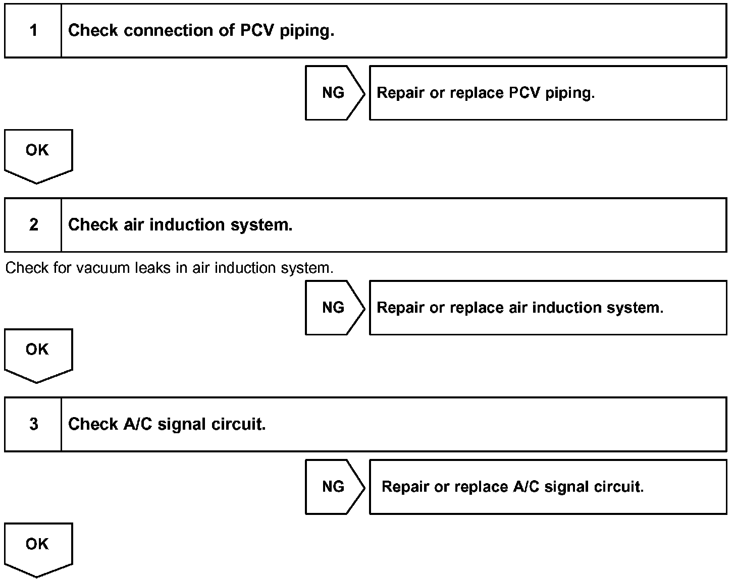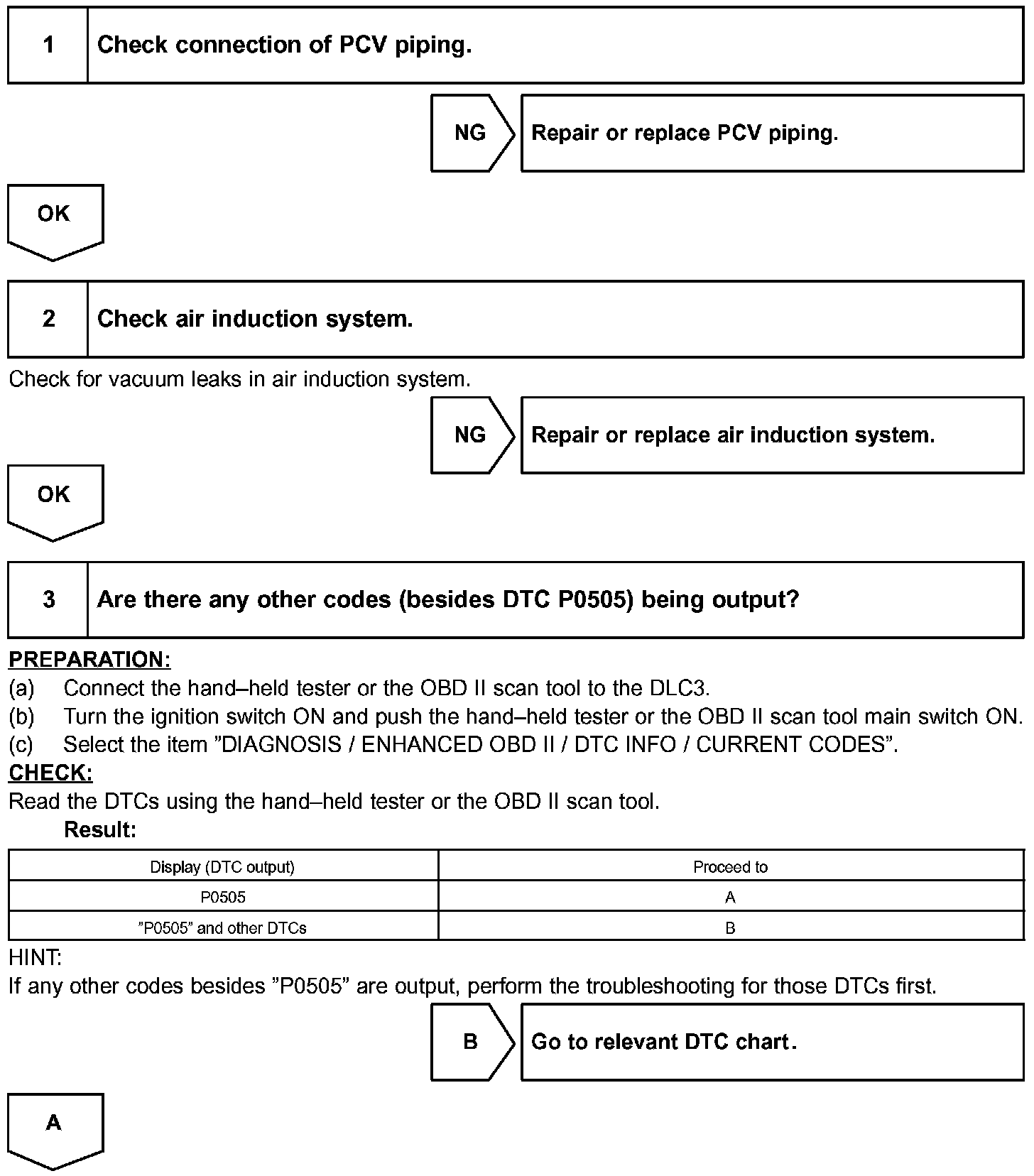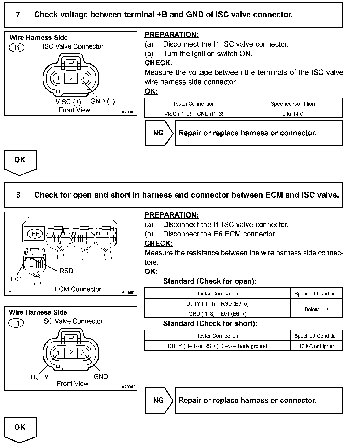 Although the ECM regulates the idle engine RPM with the feedback control, actual idle RPM dose not reach the targeted RPM and a learned valve angle of the ISC (idle speed control) remains at the maximum or remains at the minimum, the ECM determines the condition as a malfunction in the ISC system.