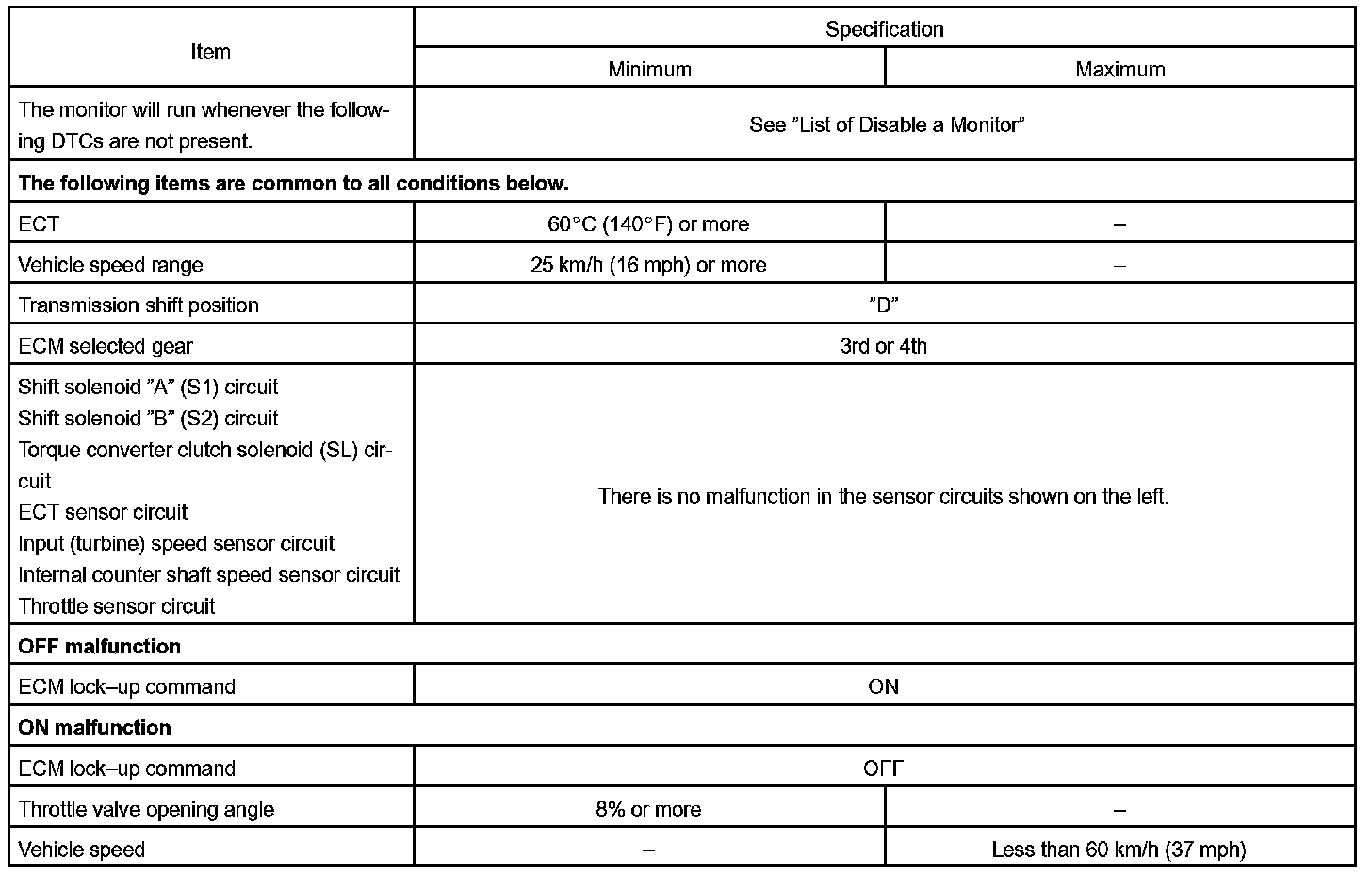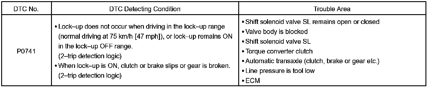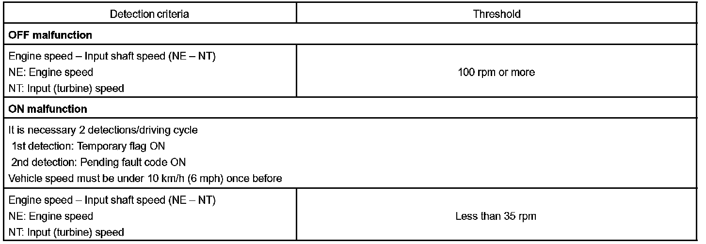 If the ECM detects no lock-up after lock-up has been requested or if it detects lock-up when it is not requested, the ECM interprets this as a fault in the torque converter clutch performance. The ECM will turn on the MIL and store the DTC.