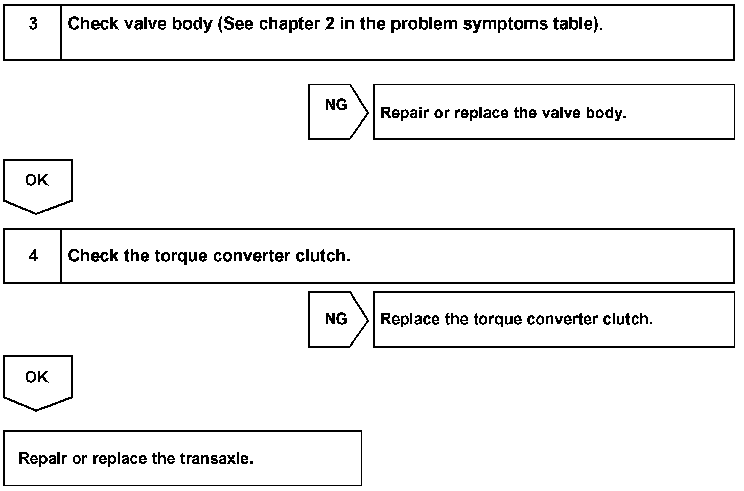 Then the ECM compares the engagement condition of the lock-up clutch with the lock-up schedule in the ECM memory to detect mechanical trouble of the shift solenoid valve SL, valve body and torque converter clutch or automatic transaxle (clutch, brake or gear etc.).