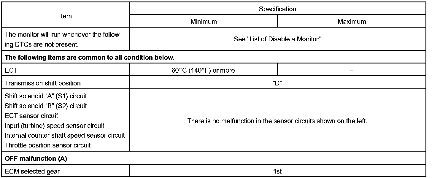 The ECM commands gear shifts by turning the shift solenoid valves "ON/OFF". According to the input shaft revolution, intermediate (counter) shaft revolution and output shaft revolution, the ECM detects the actual gear position (1st, 2nd, 3rd or O/D gear position). When the gear position commanded by the ECM and the actual gear position are not same, the ECM illuminates the MIL.