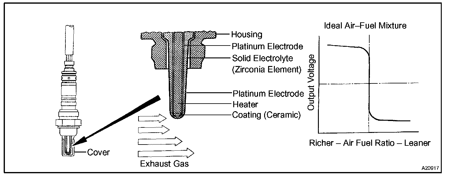 The front oxygen sensor is used to monitor oxygen concentration in the exhaust. For optimum catalytic converter operation, the air fuel mixture must be maintained near the ideal stoichiometric ratio. The heated oxygen sensor output voltage changes suddenly at the stoichiometric ratio. The ECM adjusts the fuel injection time so that the air fuel ratio is nearly stoichiometric.