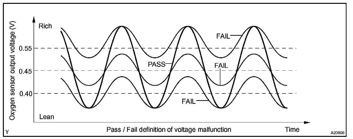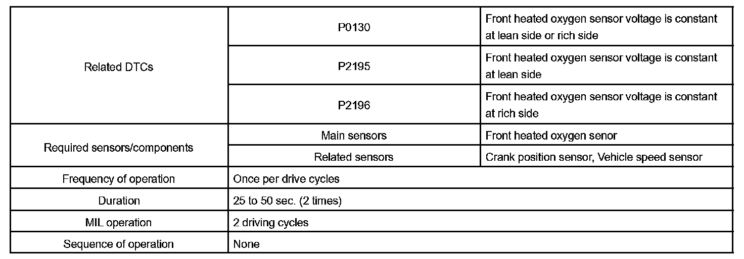 In the normal condition, the heated oxygen sensor indicates RICH and LEAN alternately with a regular cycle under the air fuel ratio feedback control. If the sensor voltage output remains at RICH, or at LEAN, the ECM interprets this as malfunction of the sensor and sets a DTC.