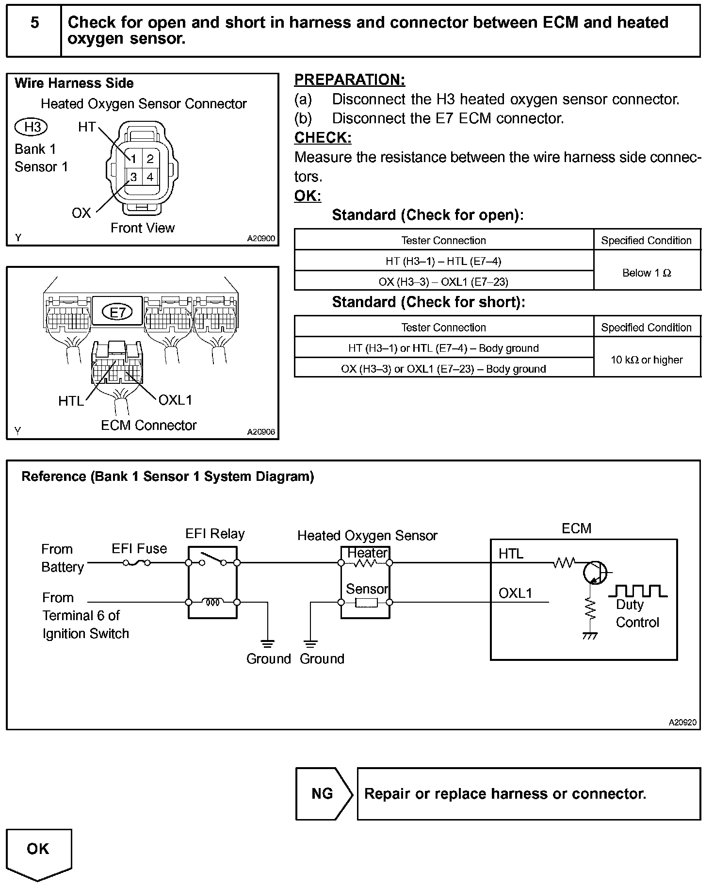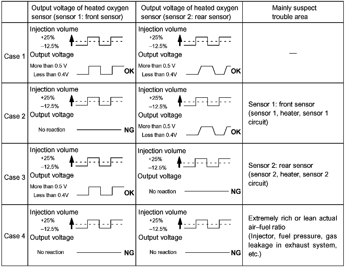 When the air-fuel ratio becomes LEAN, the oxygen concentration in the exhaust gas increases. And the heated oxygen sensor informs the ECM of the LEAN condition (low voltage, i.e. less than 0.45 V).