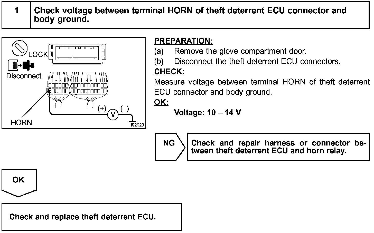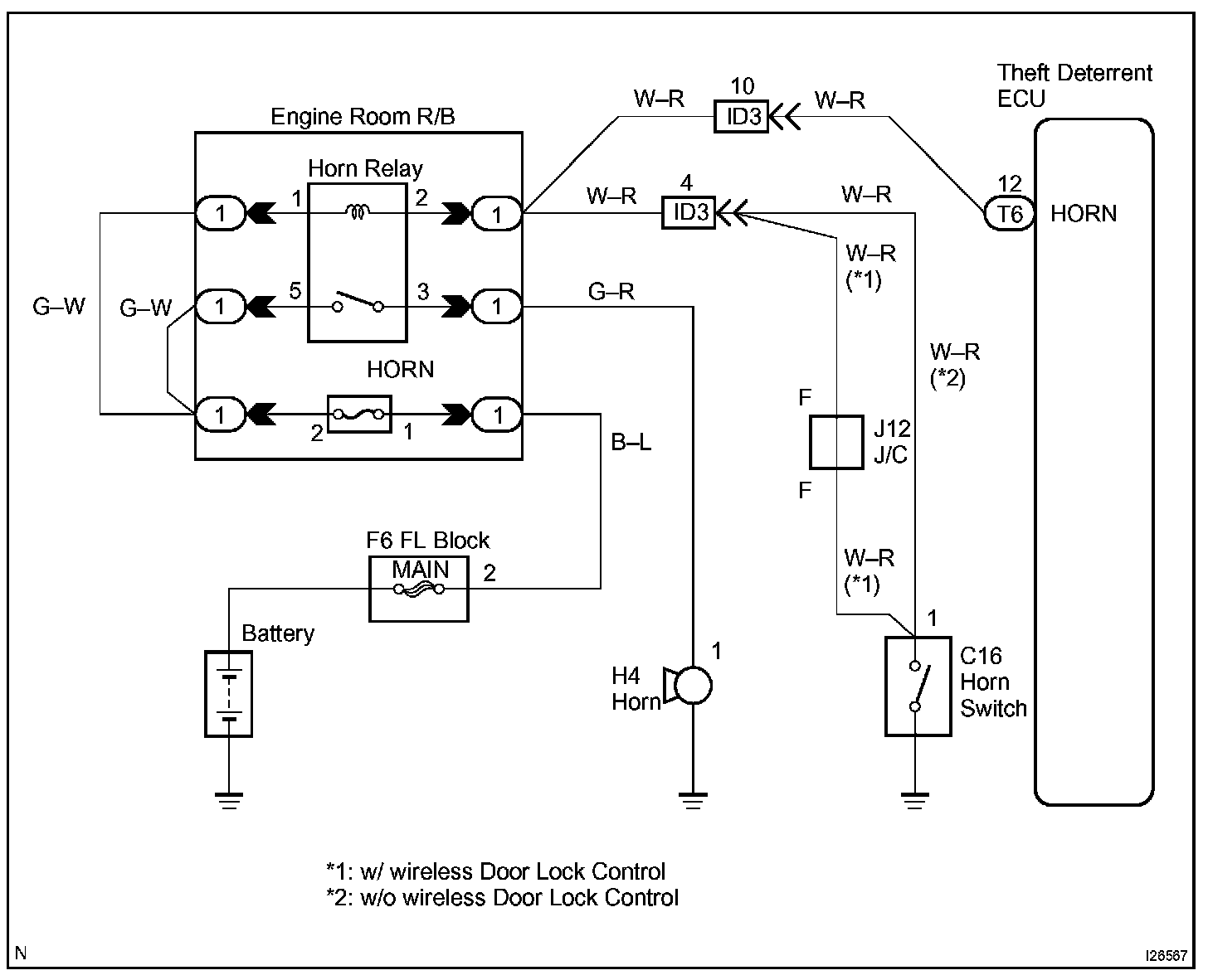 When the theft deterrent system is activated, it causes the Tr in the ECU to switch ON and OFF in approximately 0.4 sec. cycles. This switches the horn relay ON and OFF, thus the horns blow (See the wiring diagram).