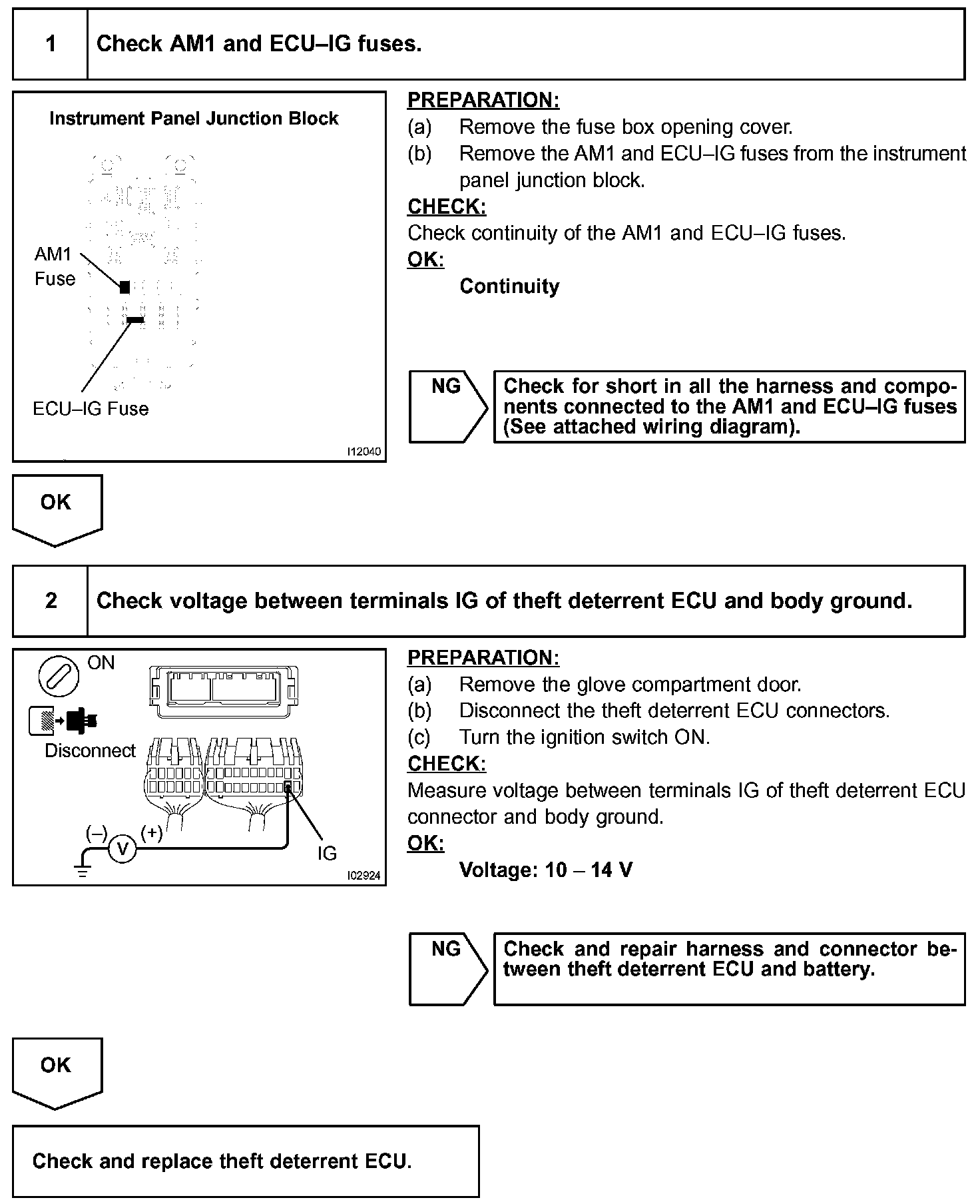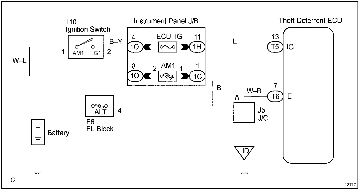 When the ignition switch is turned to the ACC position, battery positive voltage is applied to the terminal ACC of the ECU. Also, if the ignition switch is turned to the ON position, battery positive voltage is applied to the terminals ACC and IG of the ECU. When the battery positive voltage is applied to the terminal ACC of the ECU while the theft deterrent system is activated, the warning stops. Furthermore, power supplied from the terminals ACC and IG of the ECU is used as power for the door courtesy switch, and position switch, etc.