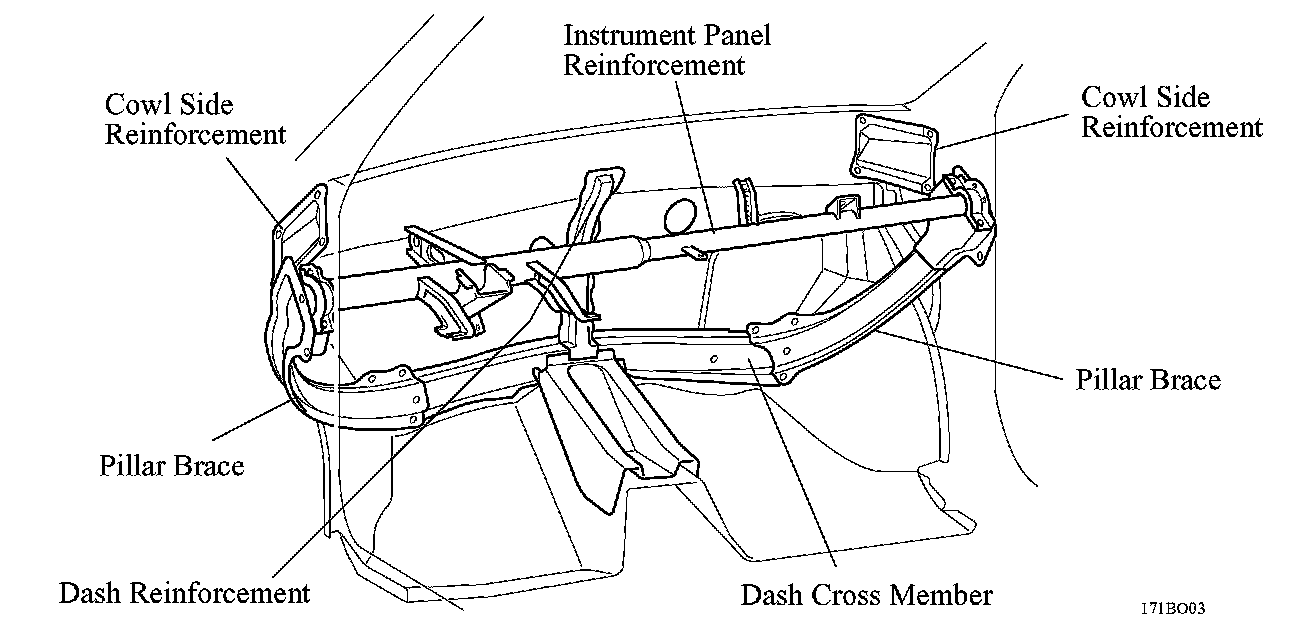 ^ By adopting the instrument panel reinforcement, dash cross member, pillar brace, dash reinforcement and cowl side reinforcement, thus results in having the structure to disperse the impact at the collision. Also, at the same time, the vibration of the dash panel and the front window is restrained.