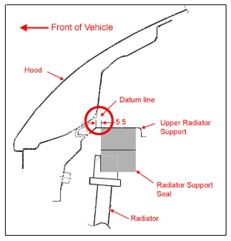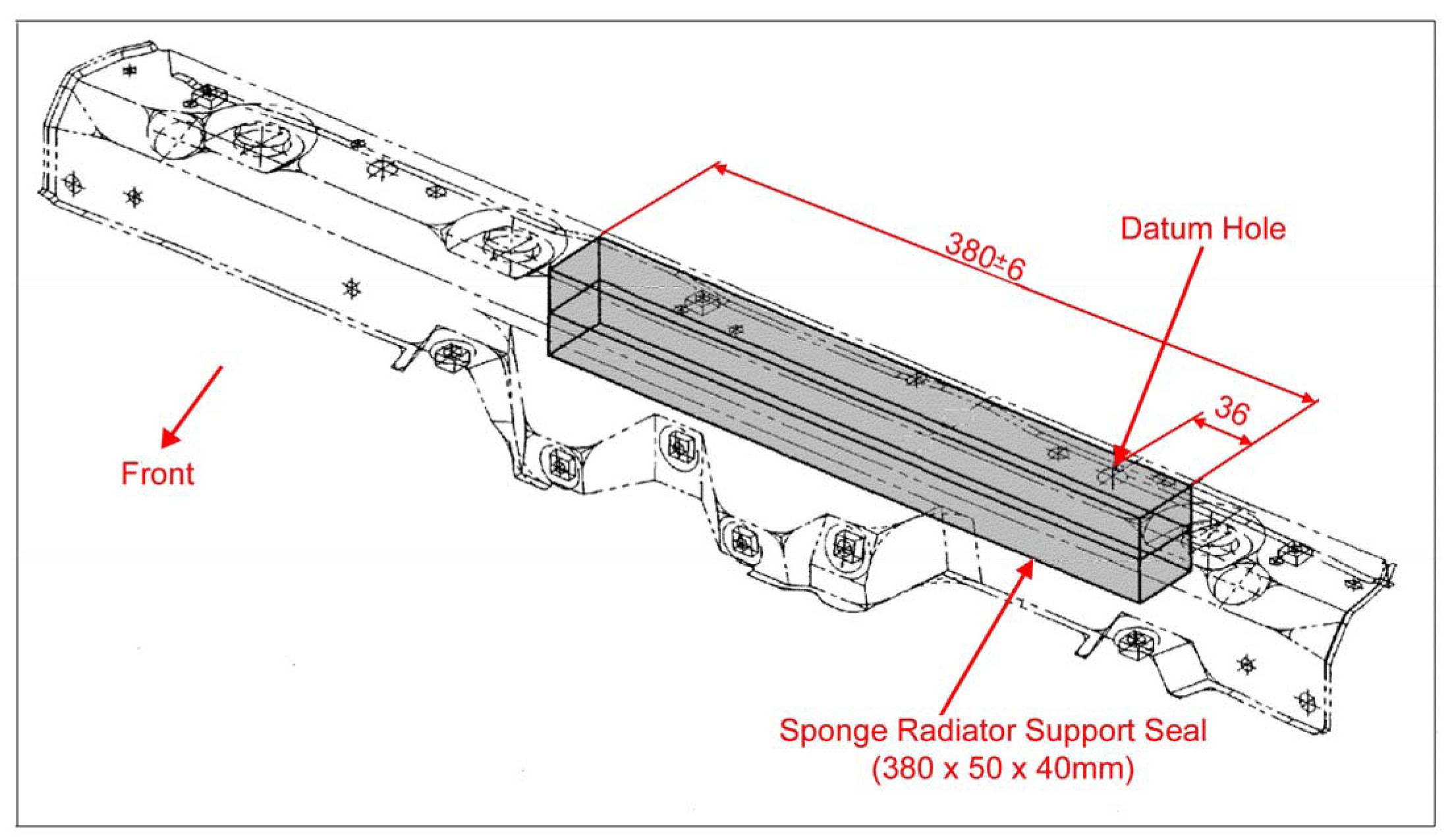 a) Locate the datum hole on the radiator upper center support and position one end of the sponge seal 36mm left of the datum hole (see diagram).