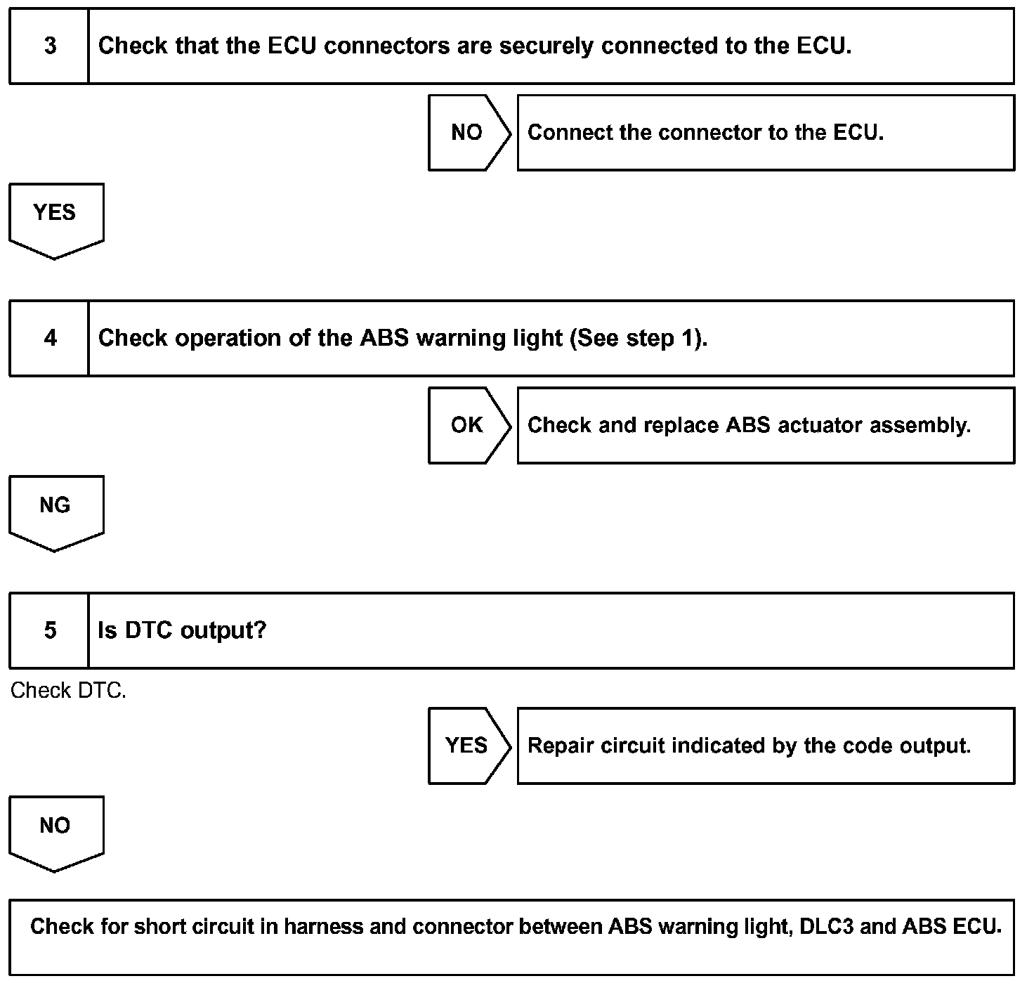If the ECU detects trouble, it lights the ABS warning light while at the same time prohibiting ABS control. At this time, the ECU records a DTC in memory.