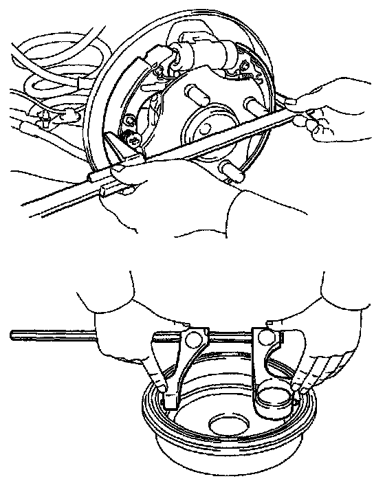 b. Using needle-nose pliers, disconnect the parking brake cable from the parking brake lever, and remove the rear shoe.