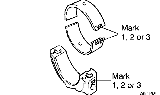 HINT: If replacing a bearing, replace it with one having the same number as marked on the connecting rod. There are 3 sizes of standard bearings, marked "1", "2" and "3" accordingly.