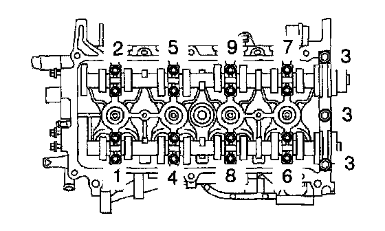 Uniformly loosen and remove the 19 bearing cap bolts, in several passes, in the sequence shown, and remove the 9 bearing caps, intake and exhaust camshafts.