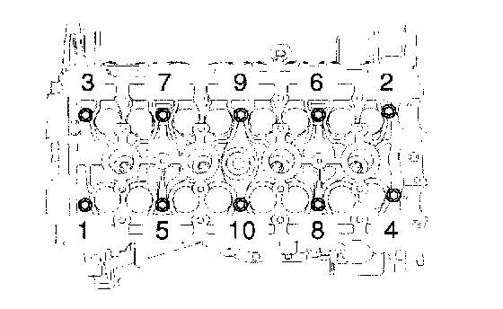 c) Using a 8 mm bi-hexagon wrench, uniformly loosen and remove the 10 cylinder head bolts, in several passes, in the sequence shown. Remove the 10 cylinder head bolts and plate washers.