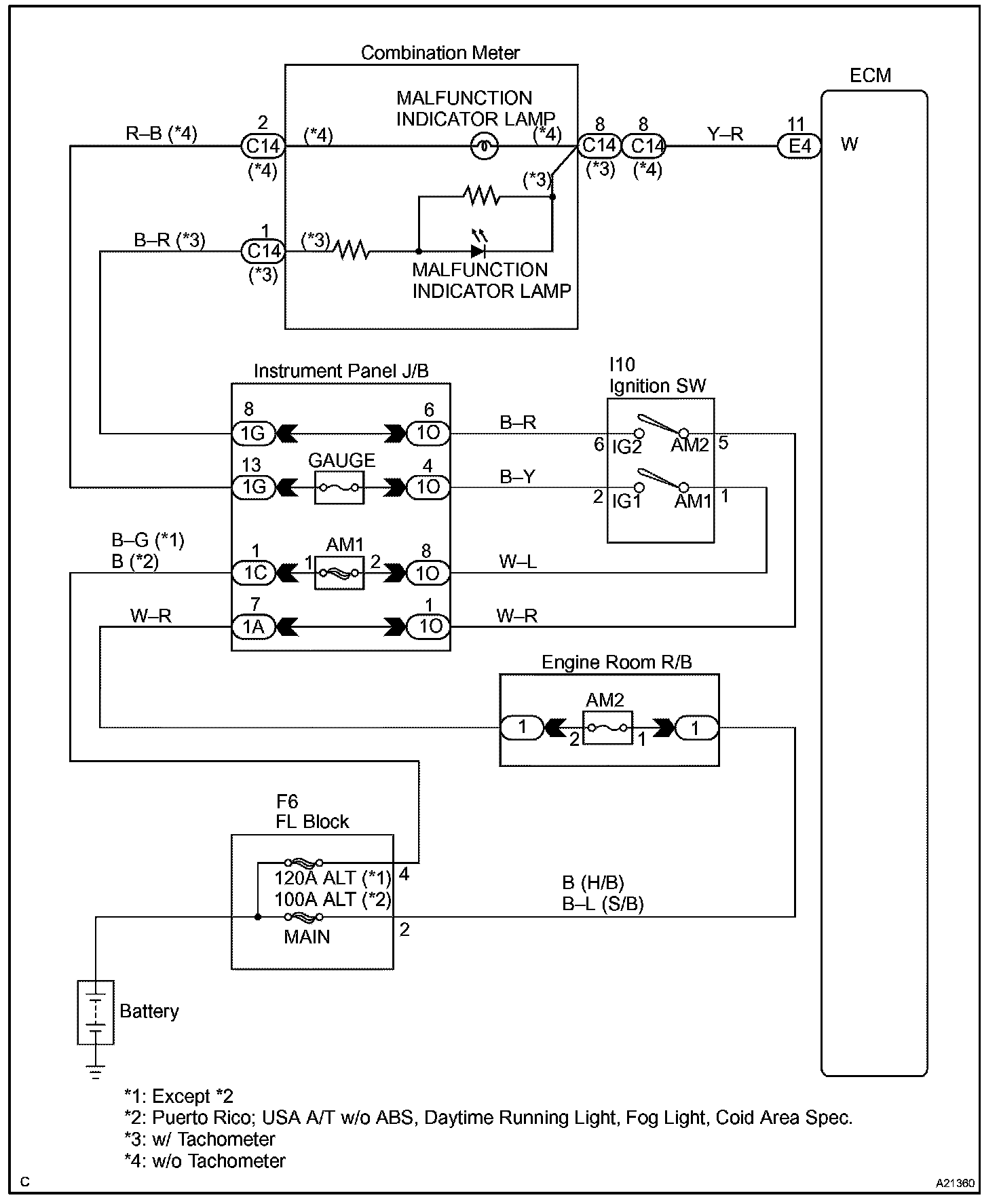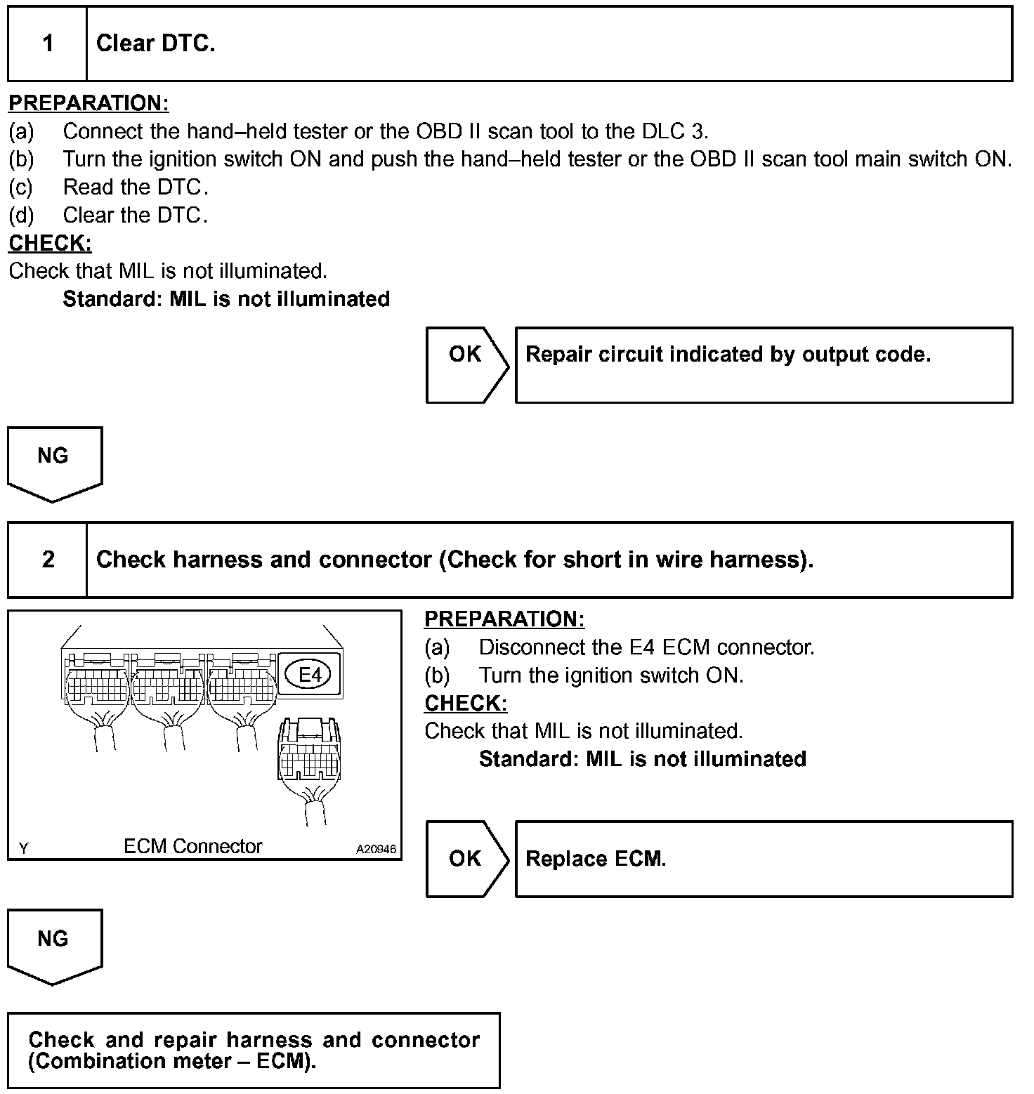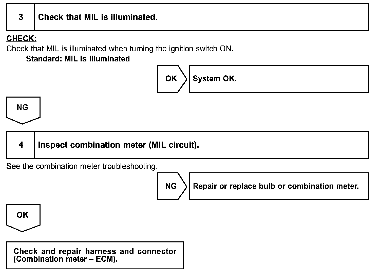 It should be illuminated when the ignition is first turned on. If the MIL is off or on all the time, use the procedure to troubleshoot it. The MIL is used to indicate the ECM's detection of a vehicle malfunction. Follow this procedure using the hand-held tester or an OBD II scan tool to determine the cause of the problem and to check the MIL.