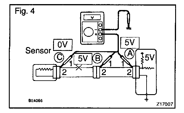 As shown in Fig. 4, with each connector still connected, measure the voltage between body ground and terminal 1 of connector "A" at the ECU 5 V output terminal, terminal 1 of connector "B", and terminal 1 of connector "C", in that order.