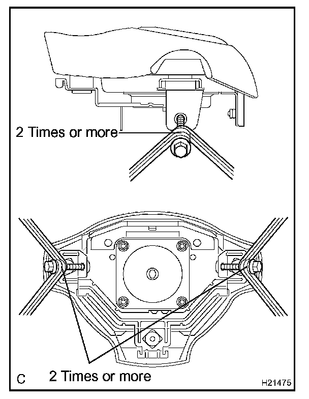 (3) Using 3 wire harness, wind wire harness at least 2 times each around the bolts installed on the left and right sides of the steering wheel pad.