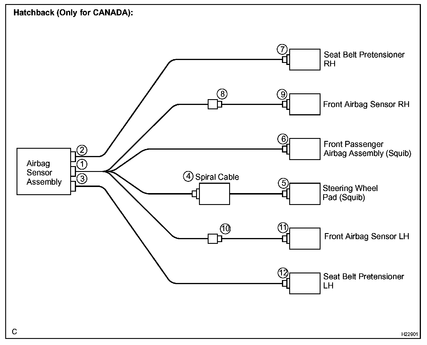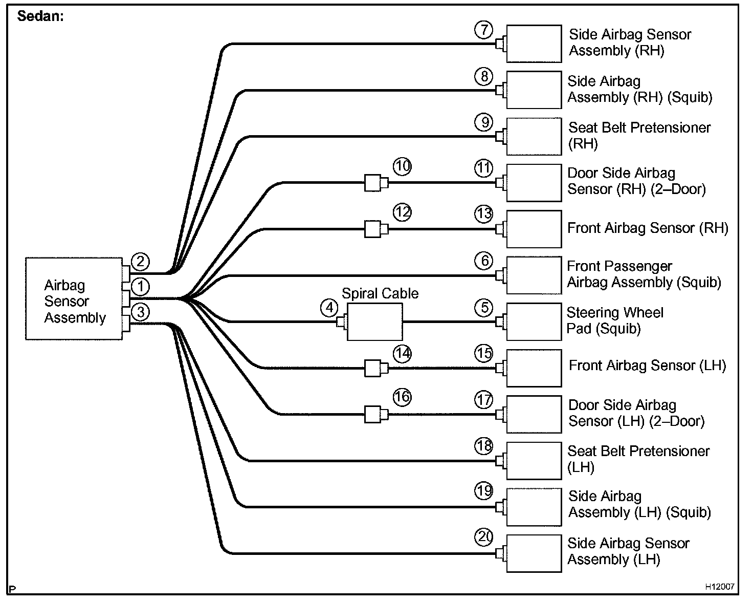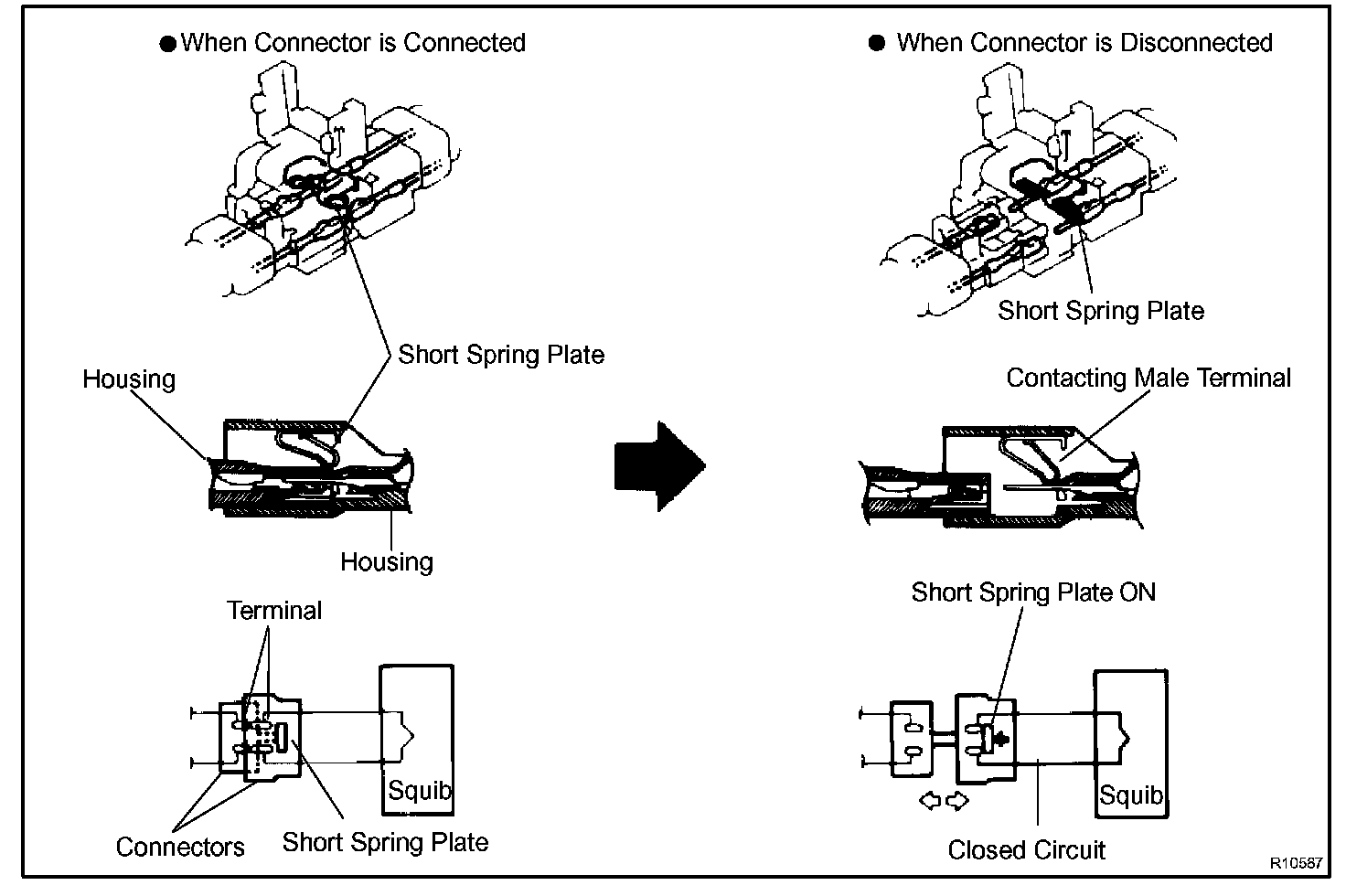 Each connector contains a short spring plate. When the connector is disconnected, the short spring plate automatically connects positive (+) terminal and negative (-) terminal of the squib.