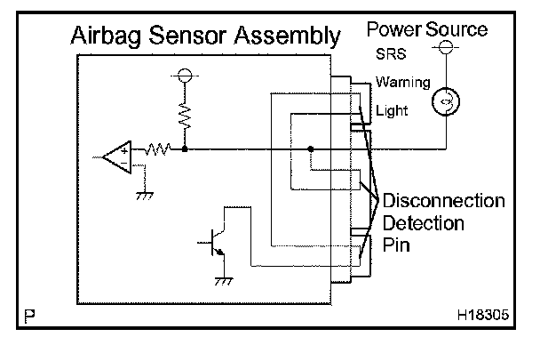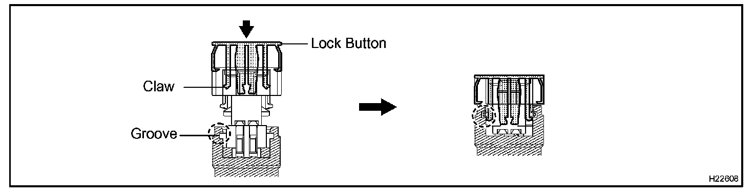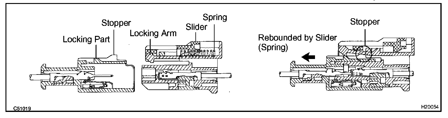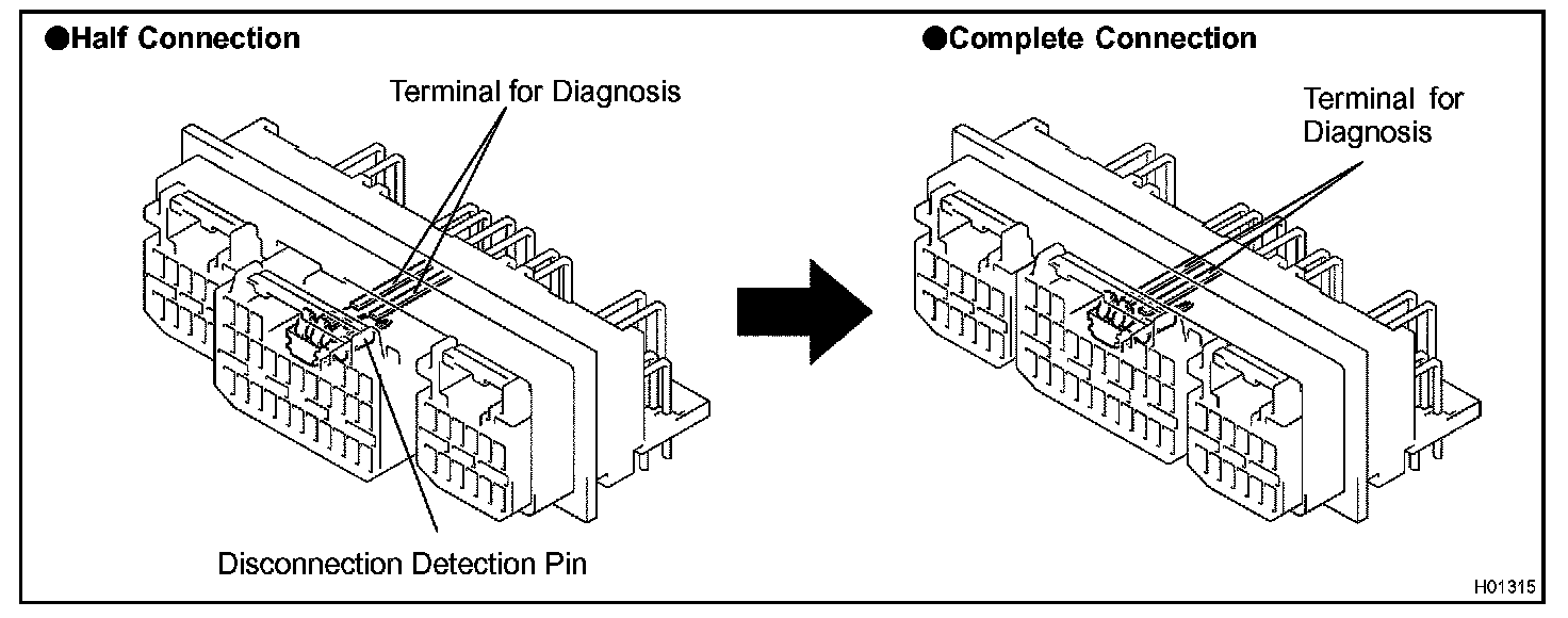 This mechanism electrically checks that the connectors are connected correctly and completely. The electrical connection check mechanism is designed so that the disconnection detection pin connects with the diagnosis terminals when the connector housing lock is locked.