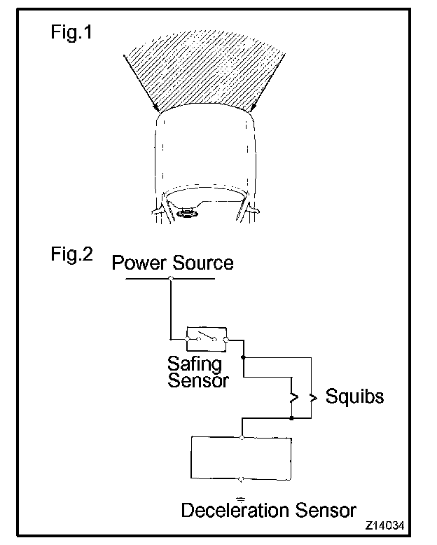 (b) When the vehicle is involved in a frontal collision in the hatched area (Fig. 1) and the shock is larger than the predetermined level, the SRS is activated automatically. The safing sensor is designed to go on at a smaller deceleration rate than the airbag sensor. As illustrated in Fig. 2, ignition is caused when current flows to the squib, which happens when the safing sensor and the deceleration sensor go on simultaneously. When a deceleration force acts on the sensors, 2 squibs in the driver airbag and front passenger airbag ignite and generate gas. The gas discharging into the driver airbag and front passenger airbag rapidly increases the pressure inside the bags, breaking the steering wheel pad and instrument panel.