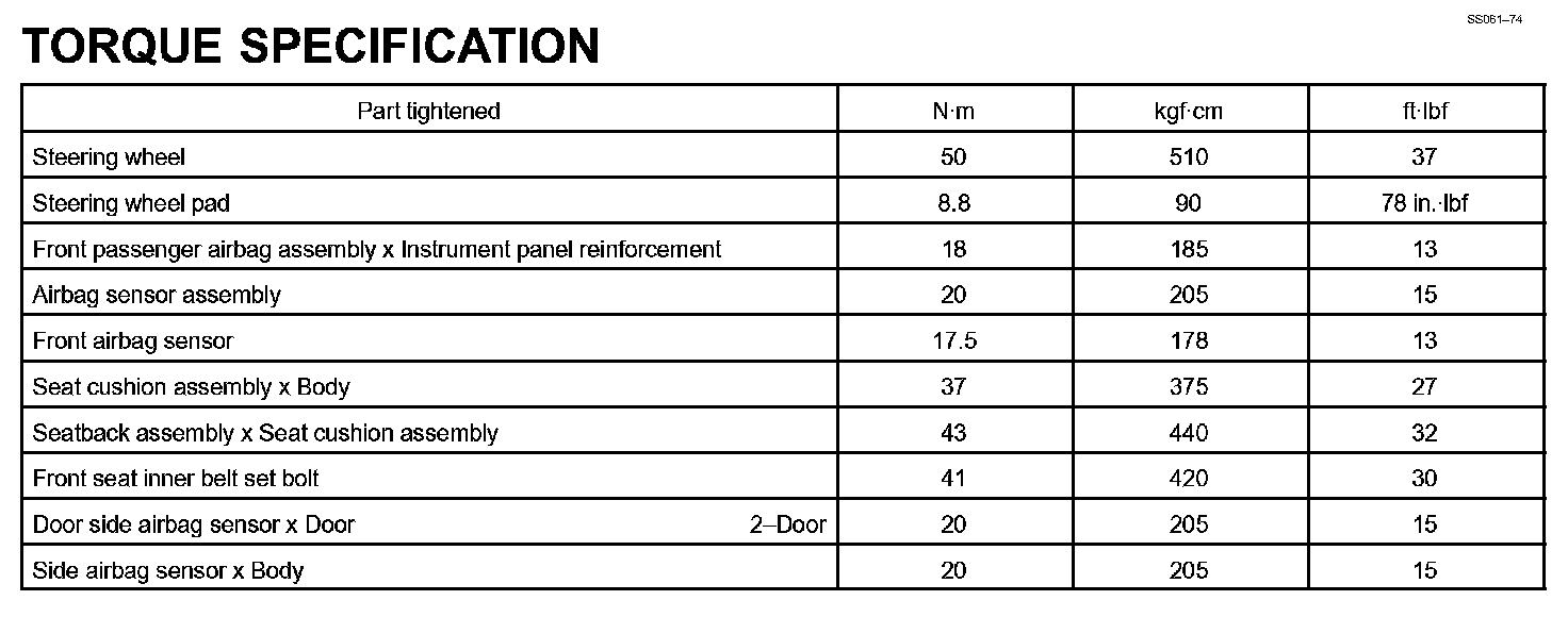 Supplemental Restraint System - Torque Specification: