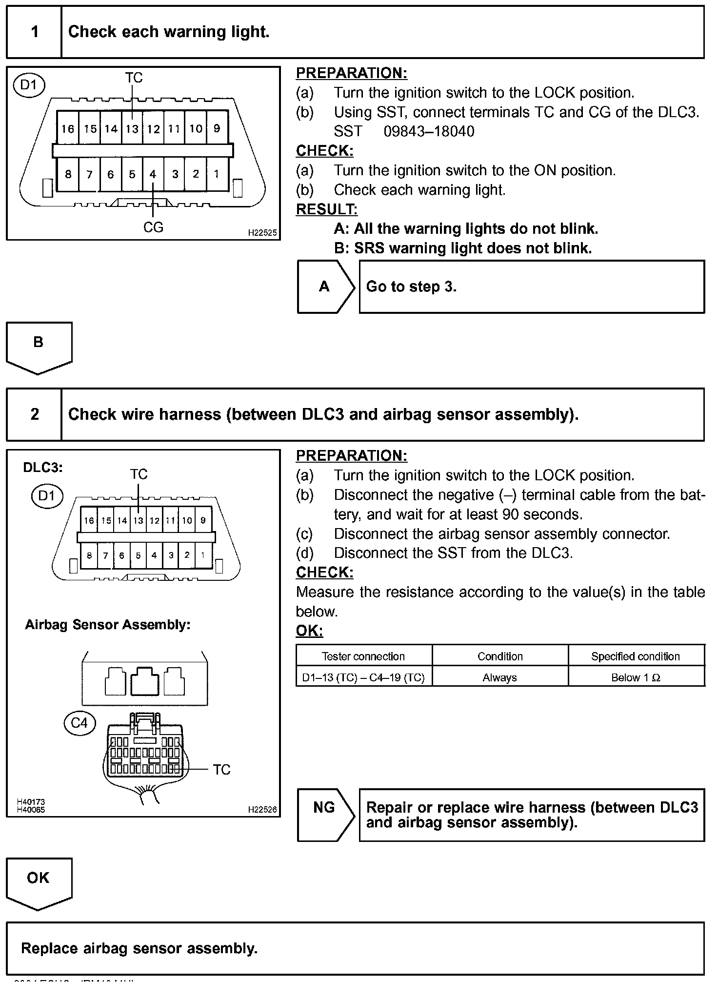 DTC output mode is set by connecting terminals TC and CG of the DLC3 of the airbag sensor assembly. The DTCs are displayed by blinking the SRS warning light.