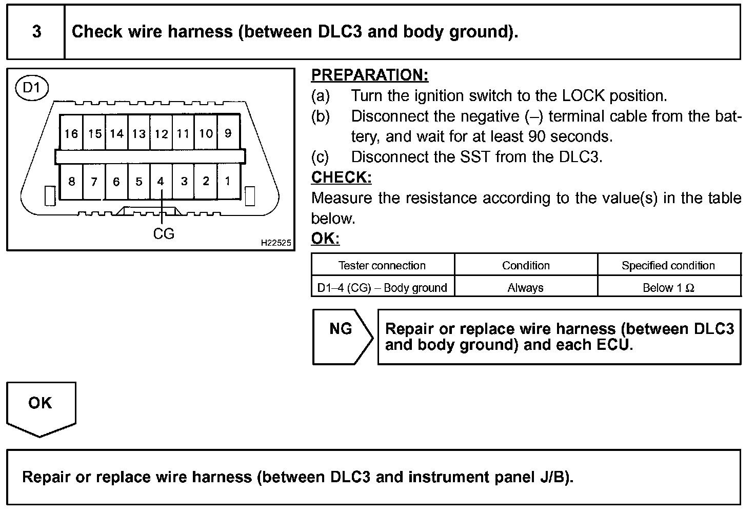 HINT: When each warning light stays blinking, a ground short in the wiring of terminal TC of the DLC3 or an internal ground short in each ECU is suspected.